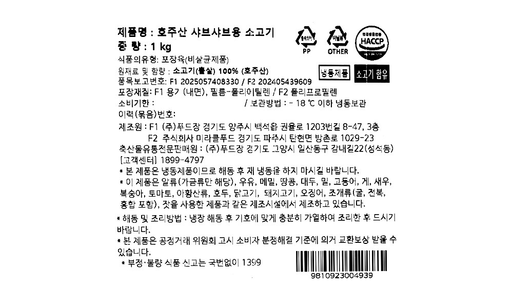 | 제조연월일, 소비기한 또는 품질유지기한 | 소비기한(또는 유통기한) : 2026년 10월 20일 이거나 그 이후인 상품<br />제조년월일 : 2025년 10월 21일 이후인 제조상품 | 세부 품목군별 표시사항 | 축산물 등급표시 : 해당 없음 / 이력번호 표시유무 : 이력번호 표시제품임 |