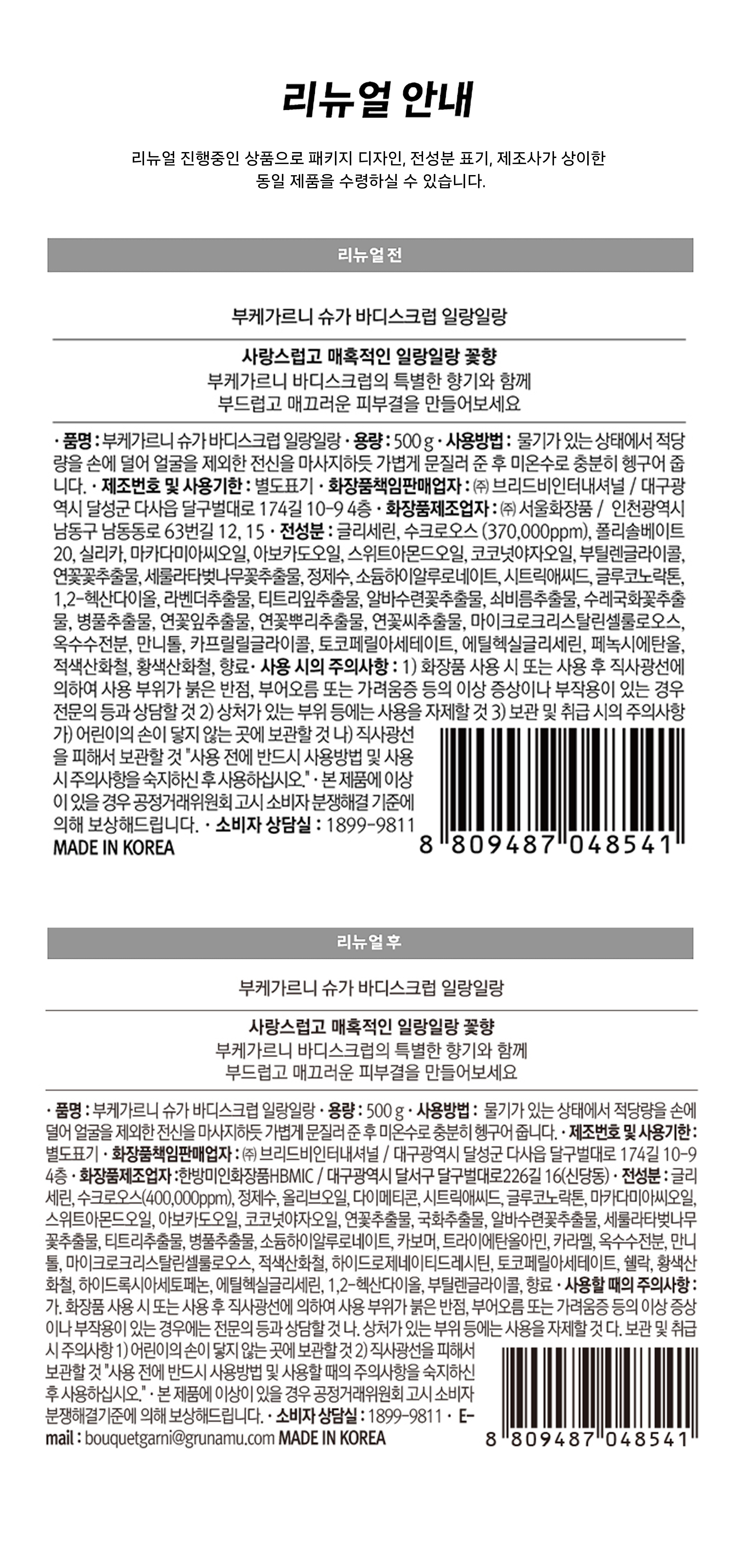 | 화장품제조업자, 화장품책임판매업자 및 맞춤형화장품판매업자 | [리뉴얼 전, 후] 컨텐츠 참조 | 제조국 | 대한민국 |