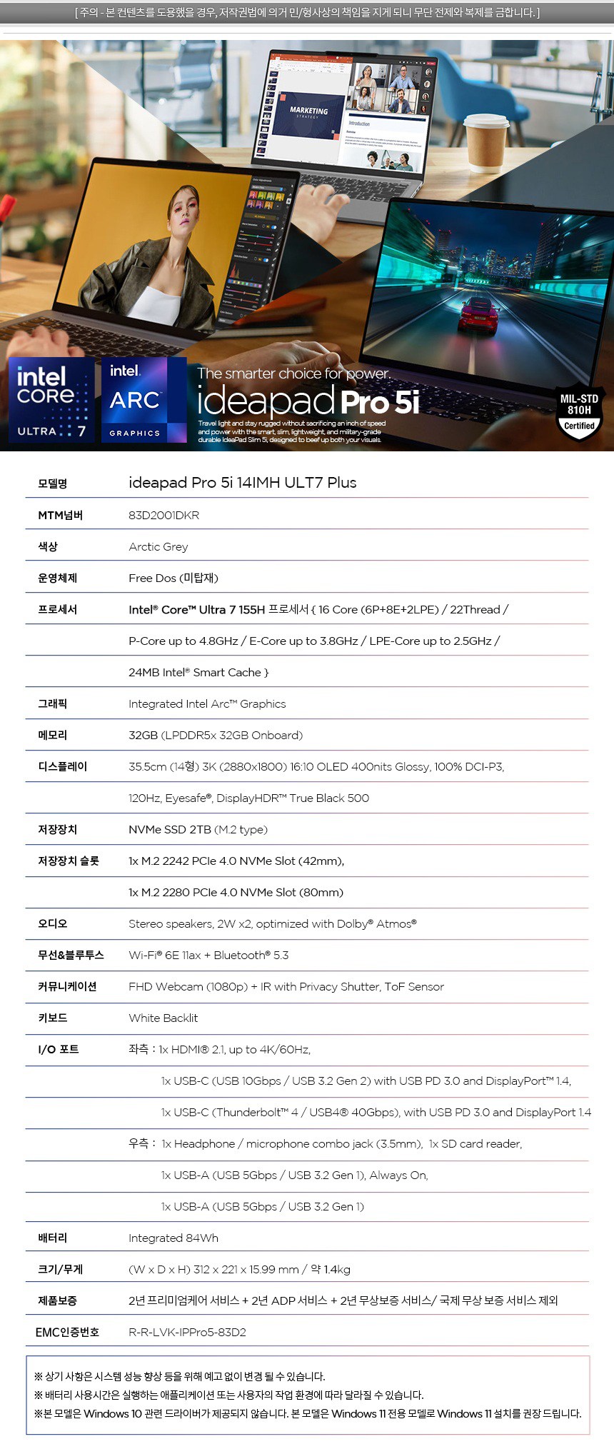 | 품명 및 모델명 | 노트북 / ldeaPad Pro 5 14IMH9 | KC 인증정보 | 본품:XU102178-23037A, R-R-LVK-IPPro5-83D2ㅣ특정소출력 무선기기:R-C-INT-AX211NGW |