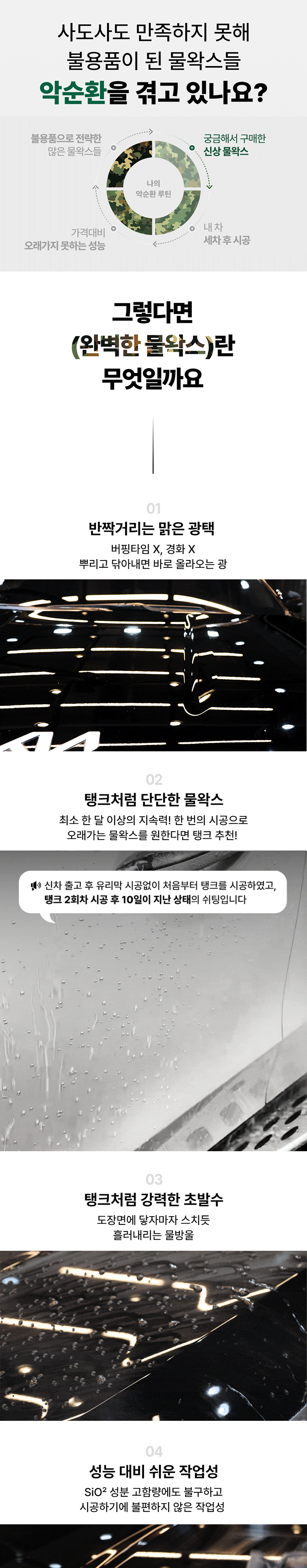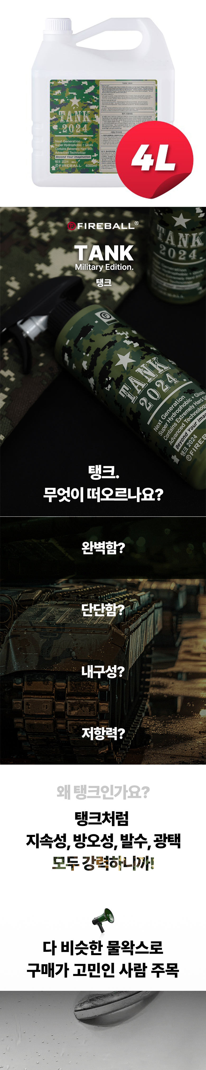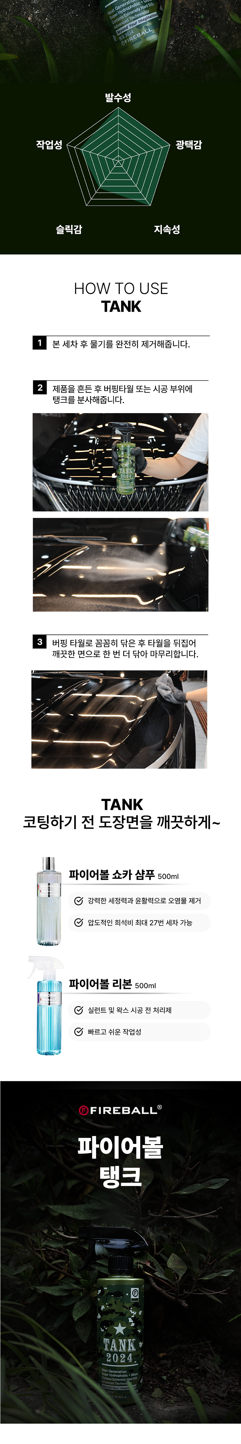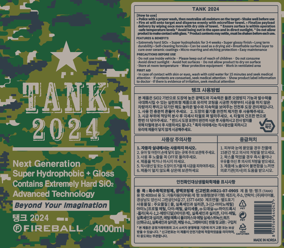 | 품목 및 제품명 | 특수목적코팅제, 광택코팅제 / 탱크 (TANK) | 용도(표백제의 경우 계열을 함께표시) 및 제형 | 자동차용(외부용) / 보충형(분무기형) |