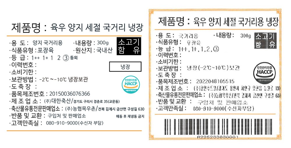 | 소비기한 또는 품질유지기한 | 소비기한(또는 유통기한) : 2026년 05월 05일 이거나 그 이후인 상품 | 세부 품목군별 표시사항 | 축산물 등급표시 : 3등급 / 이력번호 표시유무 : 이력번호 표시제품임 |