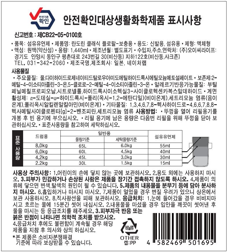 | 품목 및 제품명 | 섬유유연제 / 란도린 클래식 플로랄-보충용 | 용도(표백제의 경우 계열을 함께표시) 및 제형 | 신발용,섬유용 / 액체형 |