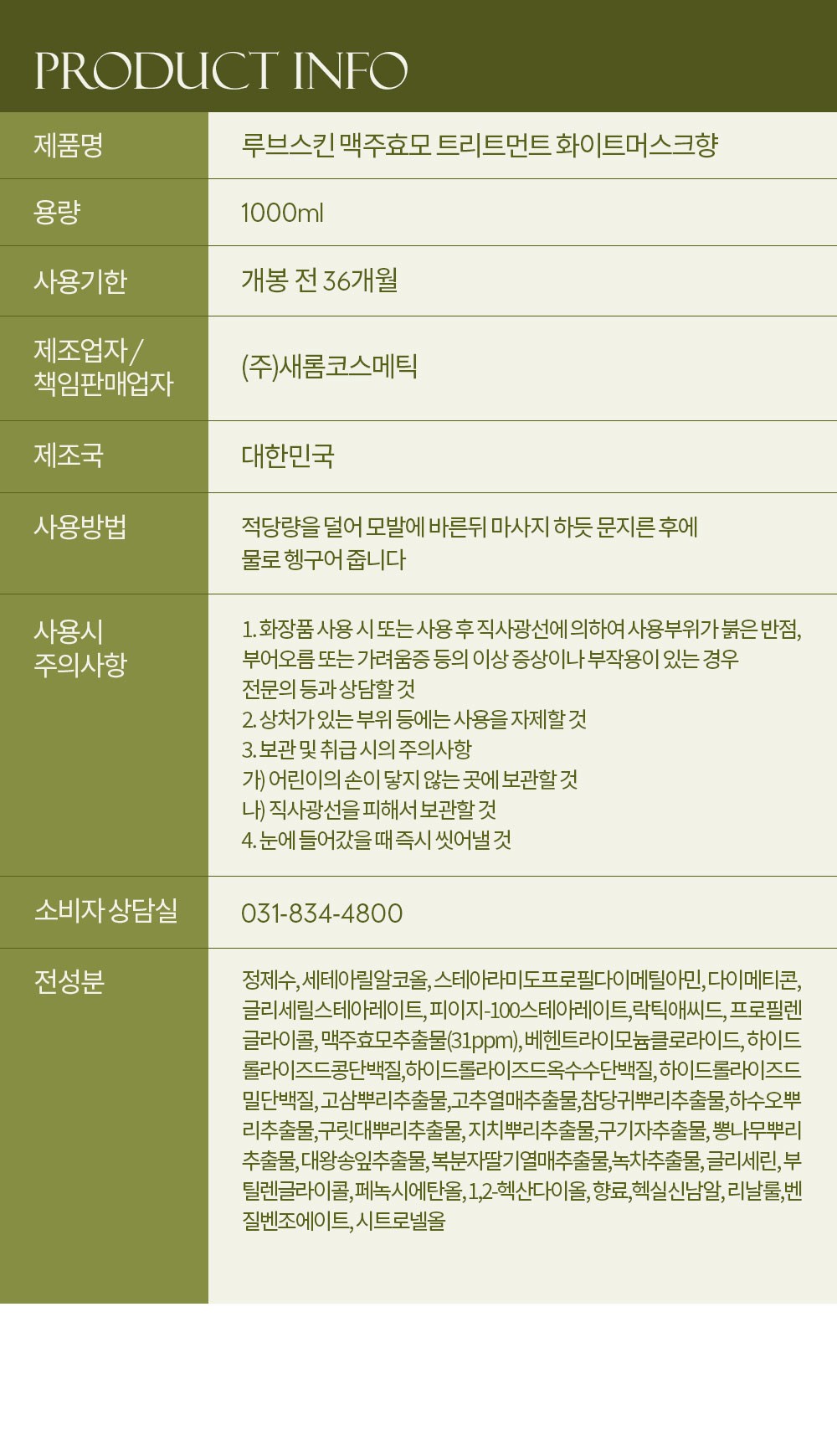 | 화장품제조업자, 화장품책임판매업자 및 맞춤형화장품판매업자 | 컨텐츠 참조 | 제조국 | 컨텐츠 참조 |