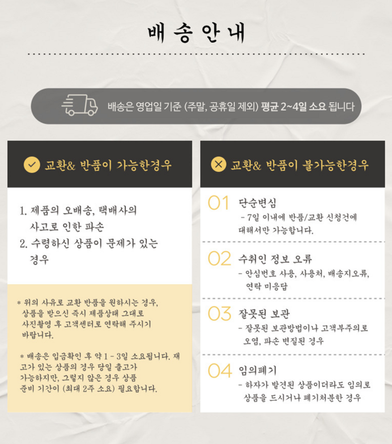 | 배송기간 | ㆍ도서산간 지역 등은 배송에 3-5일이 더 소요될 수 있습니다. - 천재지변, 물량 수급 변동 등 예외적인 사유 발생 시, 다소 지연될 수 있는 점 양해 부탁드립니다. | ||