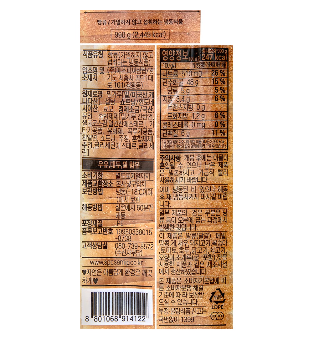 | 제품명 | 냉동뉴욕샌드위치식빵 | 식품의 유형 | 컨텐츠 참조 |
