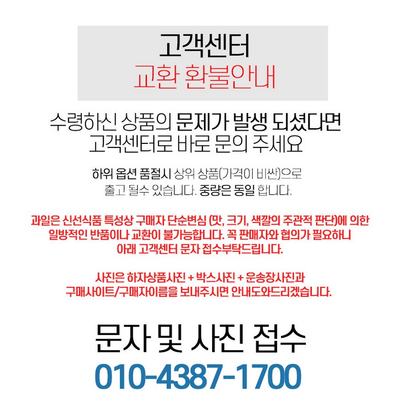 - ㆍ모니터 해상도의 차이로 인해 색상이나 이미지가 실제와 달라, 고객이 단순 변심으로 교환/반품을 무료로 요청하는 경우