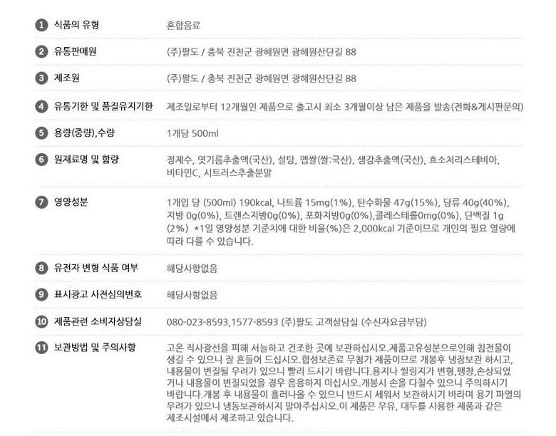 | 생산자 및 소재지 | 상품 상세페이지 참조 | 제조연월일, 소비기한 또는 품질유지기한 | 상품 상세페이지 참조 |