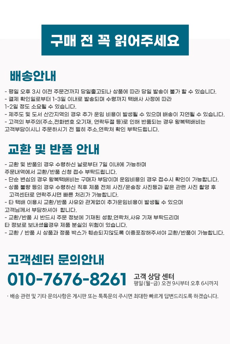 - ㆍ모니터 해상도의 차이로 인해 색상이나 이미지가 실제와 달라, 고객이 단순 변심으로 교환/반품을 무료로 요청하는 경우