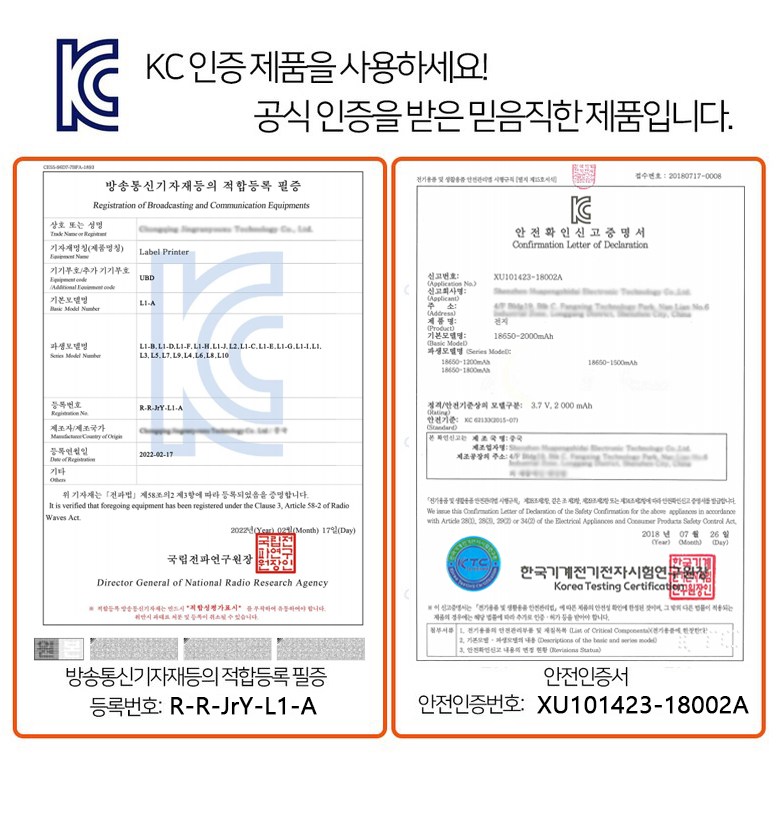 | 품명 및 모델명 | L1-D | KC 인증정보 | XU101423-18002A / R-R-JrY-L1-A |