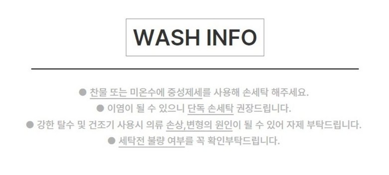 | 제조국 | 중국 | 세탁방법 및 취급시 주의사항 | 찬물 또는 미온수에 중성제세를 사용해 손세탁 해주세요.이염이 될 수 있으니 단독 손세탁 권장드립니다 |