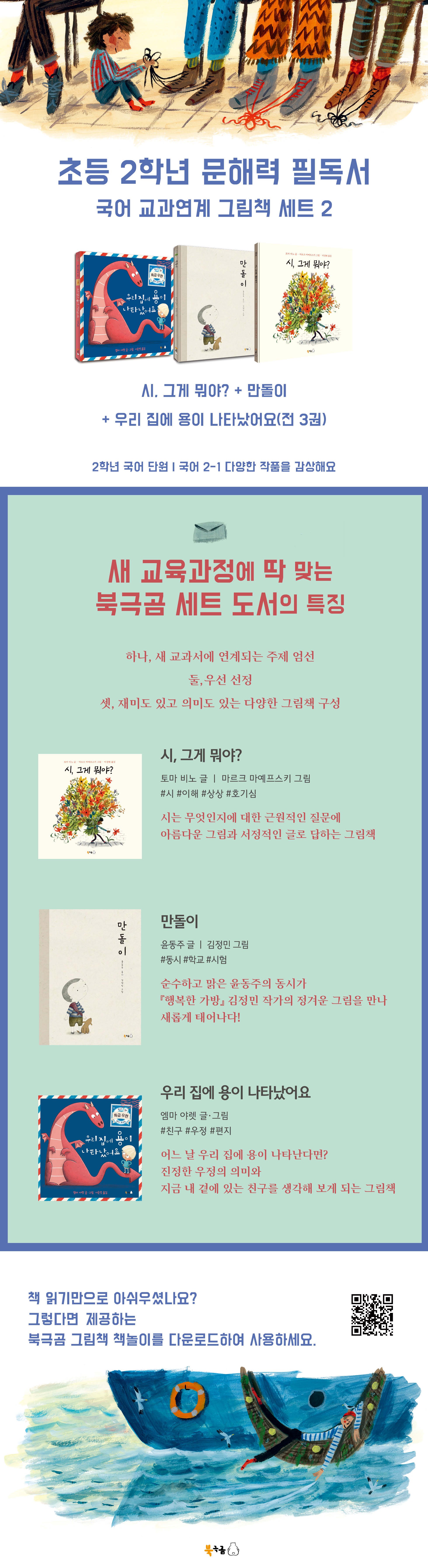 초등 2학년 문해력 필독서 국어 교과연계 그림책 세트 2 이야기에 푹 빠져들어 상상의 나래를 펼치면 어느새 문해력이 쑥쑥 자라는 북극곰 초등 2학년 문해력 필독서 국어 교과연계 그림책 세트2를 소개합니다. 멀고도 어렵게만 느껴지는 시를 다양하게 표현하여 열린 마음으로 바라볼 수 있게 하는 『시, 그게 뭐야?』, 시험에 대한 걱정과 아이의 천진난만함을 담아 낸 윤동주 시인의 동시에 김정민 작가의 정겨운 상상력이 빚어낸 그림책 『만돌이』, 용과 함께 살고 싶은 레군이가 편지를 통해 다섯 명의 전문가와 나누는 기발하고 엉뚱하고 사랑스러운 이야기 『우리 집에 용이 나타났어요』. 북극곰 초등 2학년 문해력 필독서 국어 교과연게 그림책 세트 2는 시와 동시, 상상력을 자극하는 재치 넘치고 흥미진진한 다양한 이야기를 통해 우리 아이들에게 이야기를 보는 눈과 상상력의 힘을 일깨우는 그림책 세트입니다.
