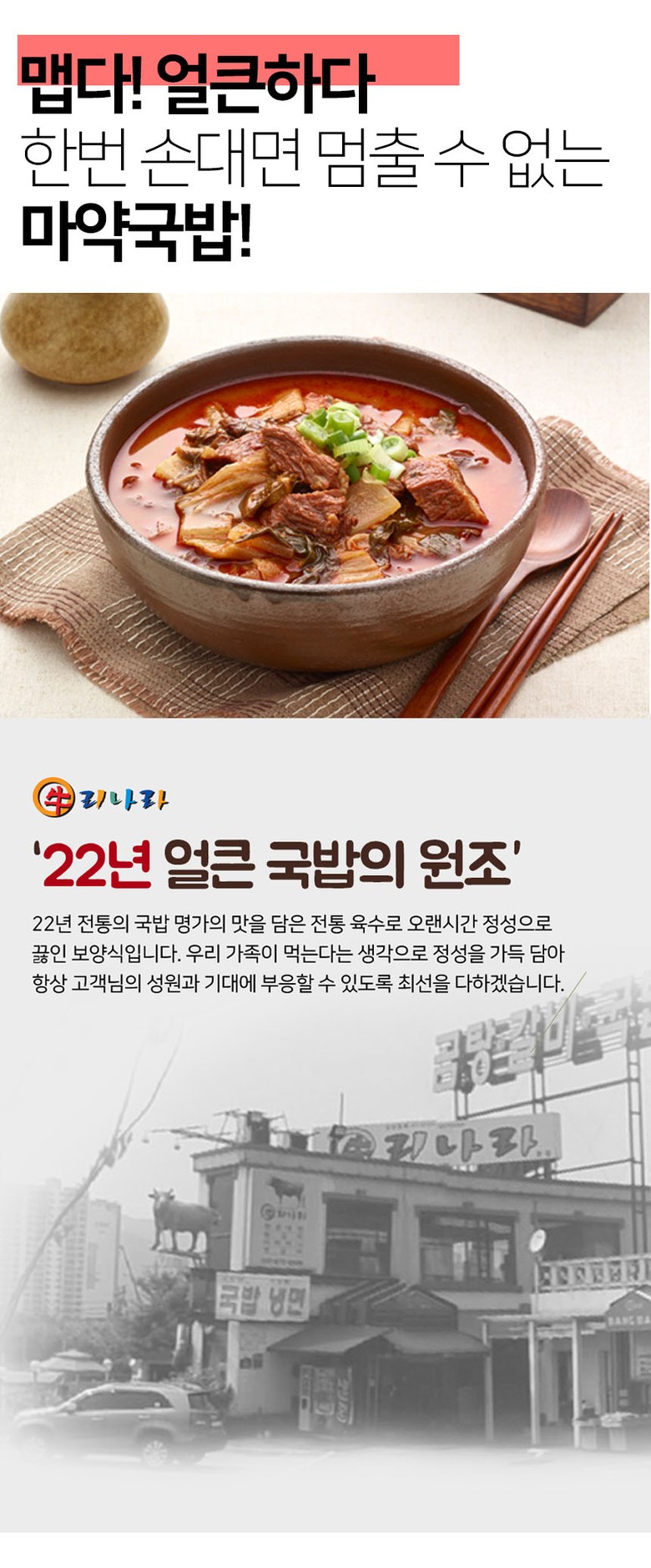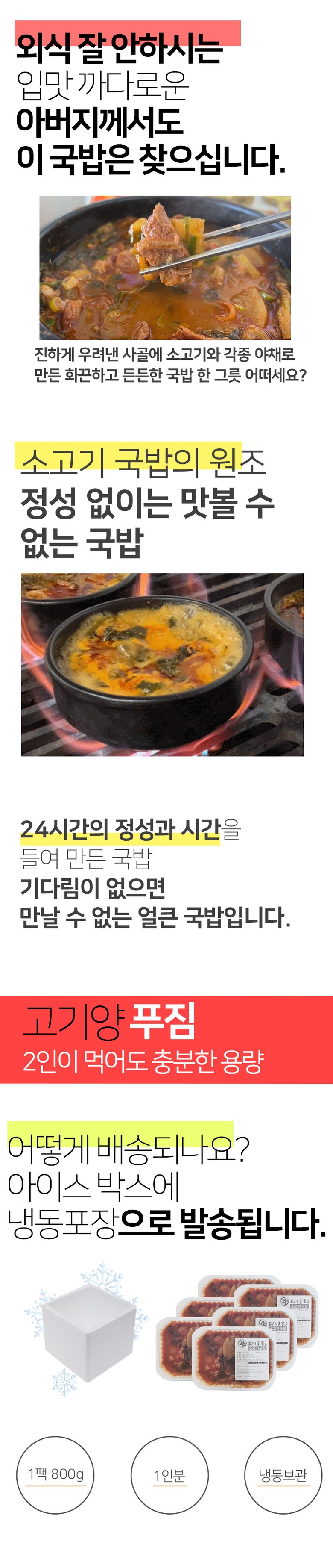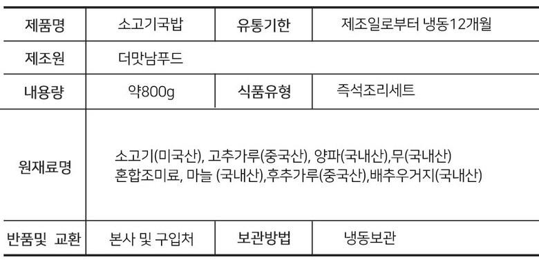 | 포장단위별 내용물의 용량(중량), 수량 | 약 800g | 원재료명 및 함량 | 소고기: 미국산 고추가루: 중국산 마늘: 중국산 배추잎: 국내산 무: 국내산 |