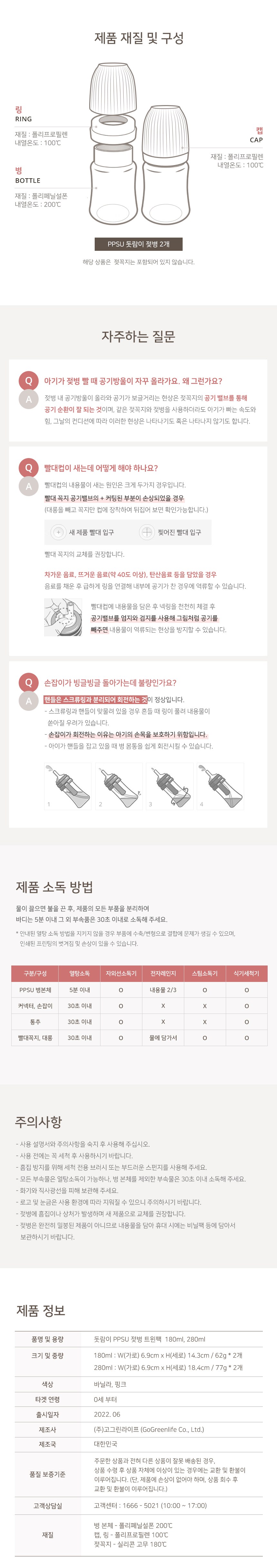 | 품명 및 모델명 | 토비앤몰리 PPSU 돗람이 젖병 180ml 트윈팩 2p | 재질 | 컨텐츠 참조 |