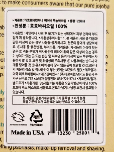 | 화장품제조업자, 화장품책임판매업자 및 맞춤형화장품판매업자 | 더호호바컴퍼니 / ㈜아로마랩 | 제조국 | 미국 |