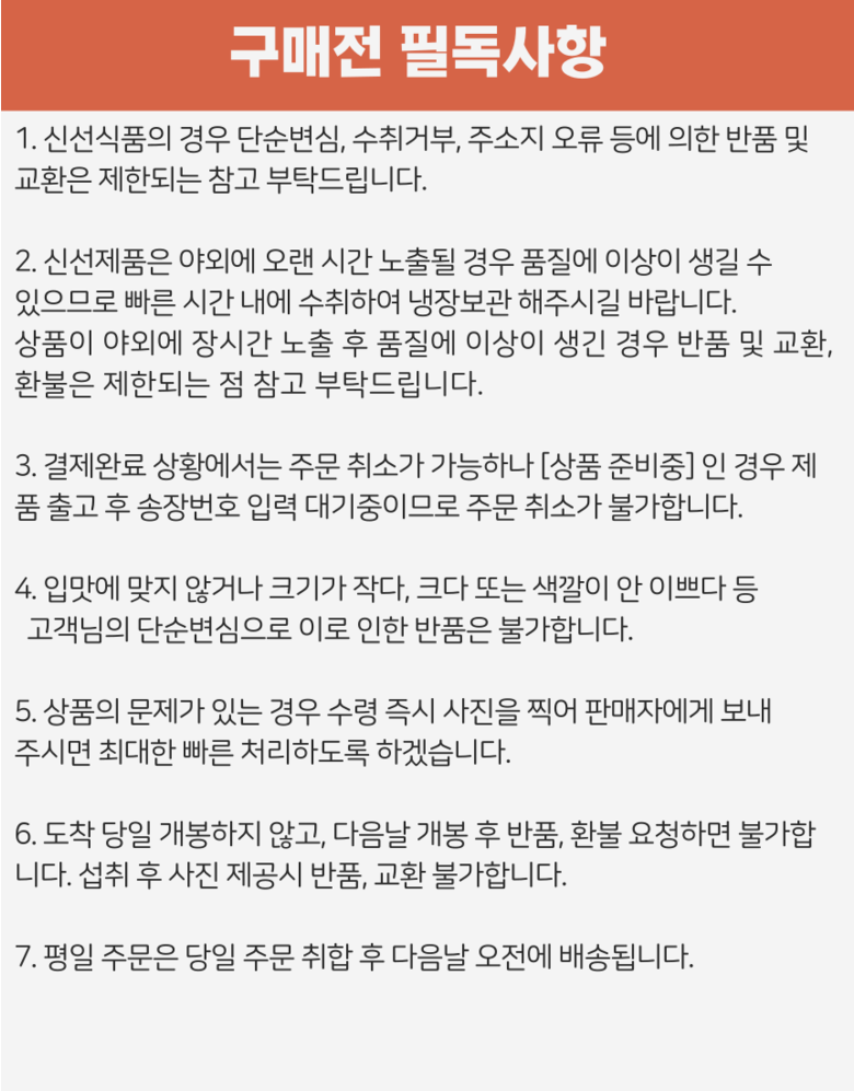 - ㆍ교환/반품에 관한 일반적인 사항은 판매자가 제시사항보다 관계법령이 우선합니다.