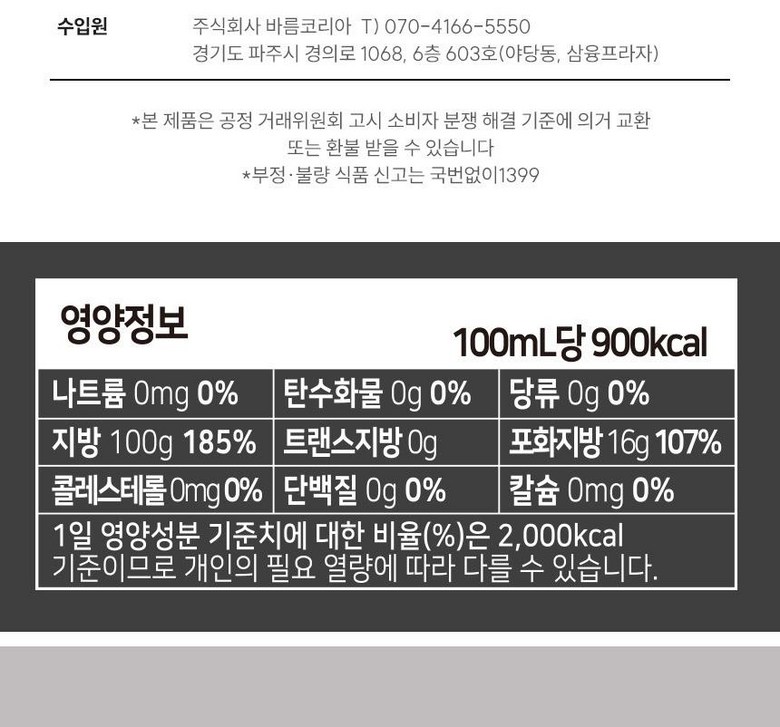 | 포장단위별 내용물의 용량(중량), 수량 | 1L / 1개 | 원재료명 및 함량 | 압착올리브유 100% |