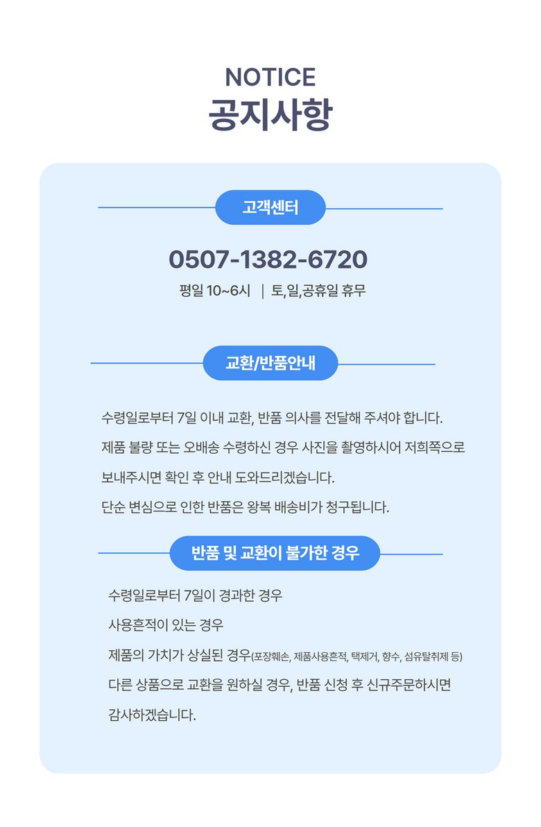 - ㆍ모니터 해상도의 차이로 인해 색상이나 이미지가 실제와 달라, 고객이 단순 변심으로 교환/반품을 무료로 요청하는 경우