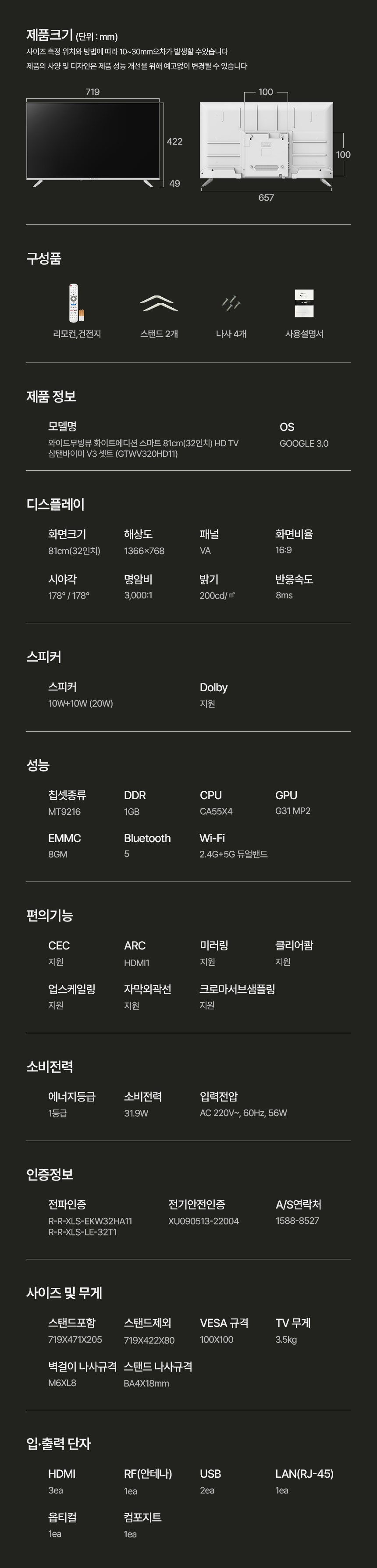 | 품명 및 모델명 | 텔레비전수상기 / GTWV320HD11 + 와이드무빙뷰 삼탠바이미 V3 세트 | KC 인증정보 | 본품: XU090513-22004G, R-R-XLS-EKW32HA11 / 모듈: R-R-XLS-LE-32T1 / 건전지: B053R5018-18001 |
