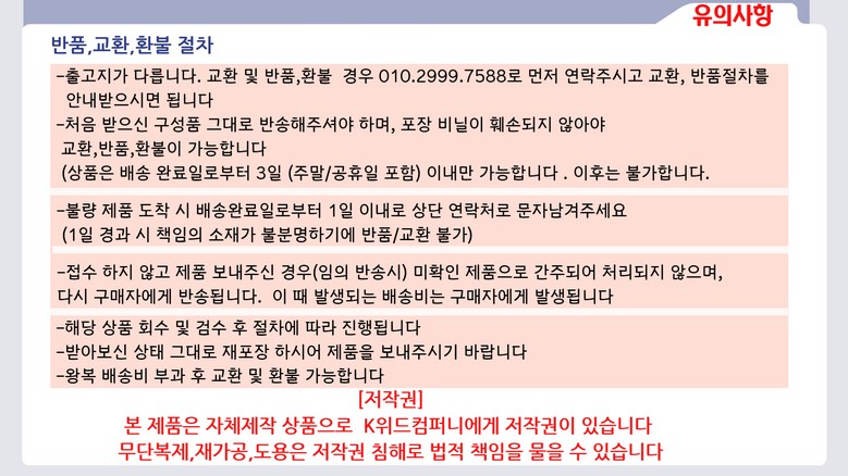 - ㆍ교환/반품에 관한 일반적인 사항은 판매자가 제시사항보다 관계법령이 우선합니다.