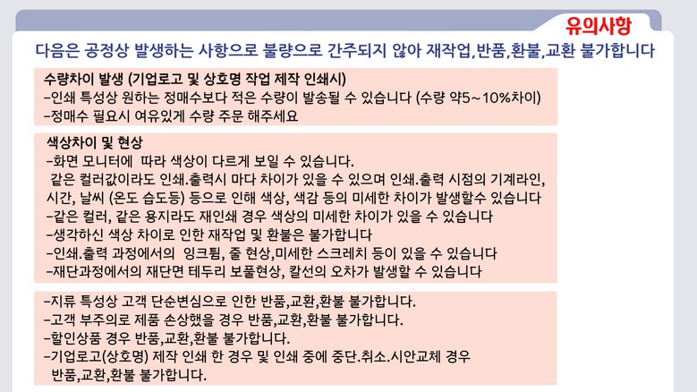 - ㆍ모니터 해상도의 차이로 인해 색상이나 이미지가 실제와 달라, 고객이 단순 변심으로 교환/반품을 무료로 요청하는 경우