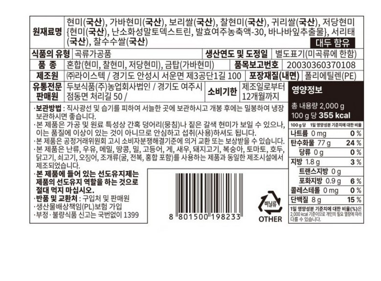 | 제조연월일, 소비기한 또는 품질유지기한 | 상품 상세페이지 참조 | 세부 품목군별 표시사항 | 상품 상세페이지 참조 |