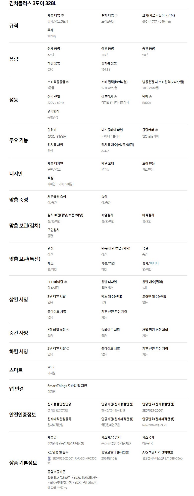 | 품명 및 모델명 | 삼성전자 김치플러스 3도어 328L RQ33DG71G1S9 | KC 인증정보 | SE07025-23001, R-R-2Dh-RQ33C71 |