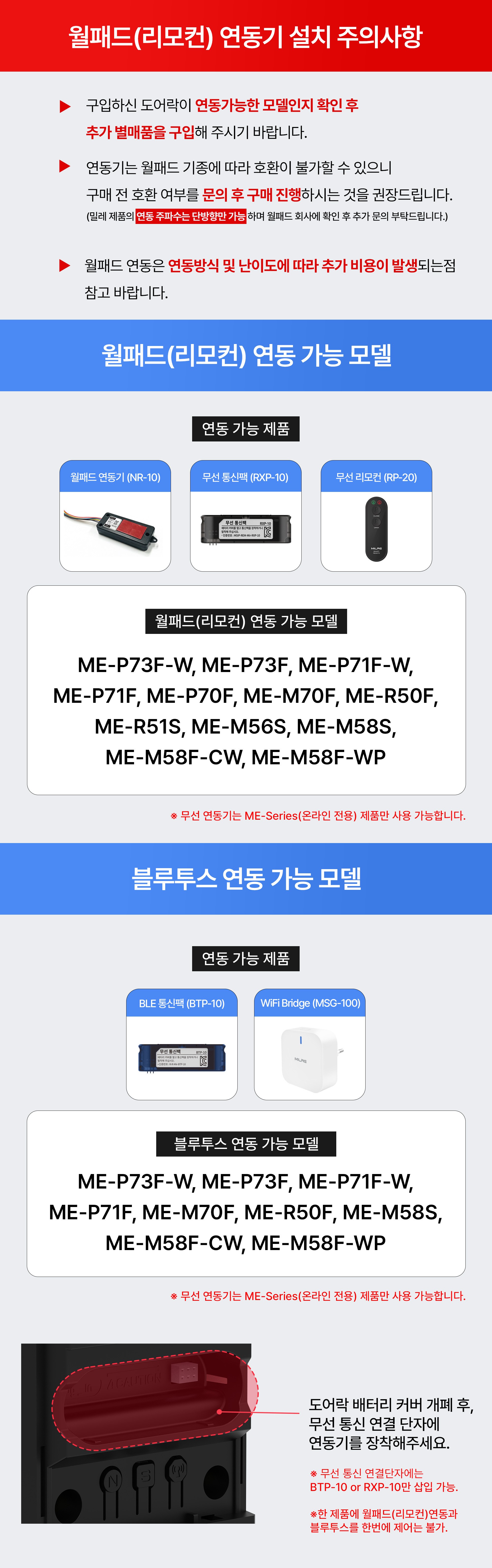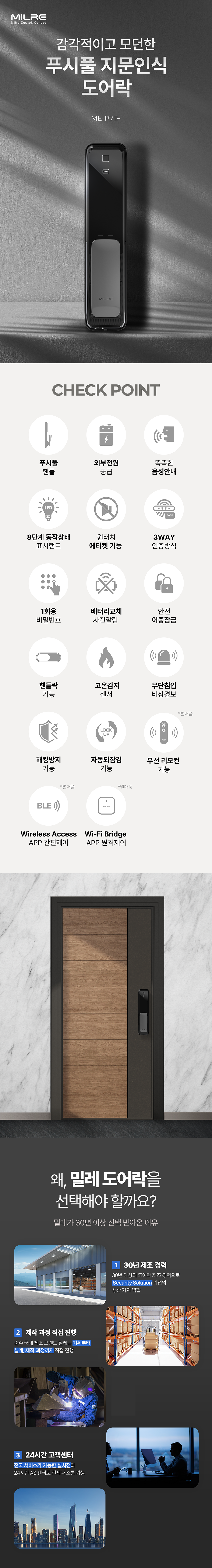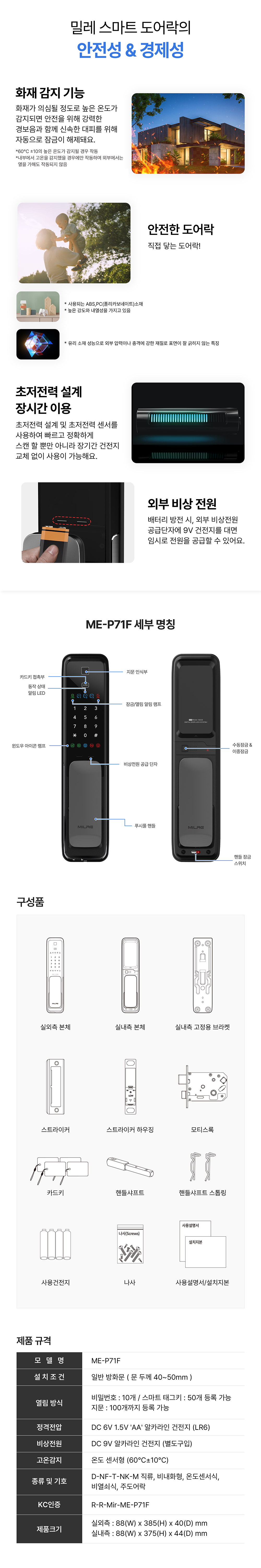 | 품명 및 모델명 | 디지털 도어록 / ME-P71F | KC 인증정보 | 본품: KSC9806 제08-0159호, B223H5012-21008D, R-R-Mir-ME-P71F | 건전지: B053R5011-20009 |