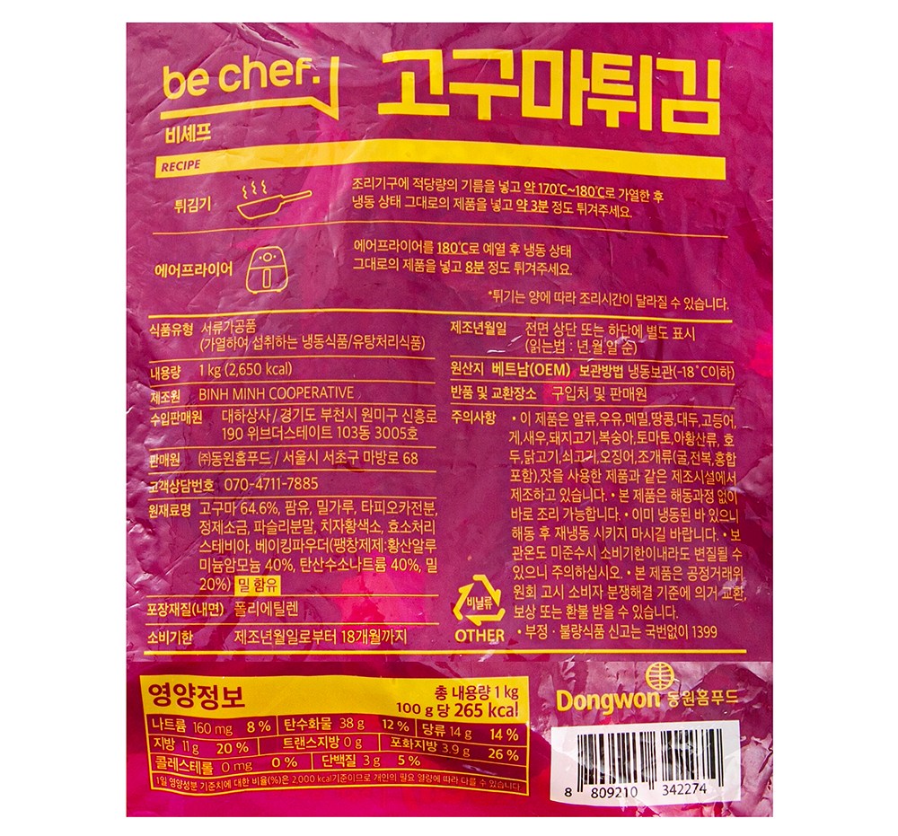 | 제품명 | 비셰프 고구마튀김 | 식품의 유형 | 컨텐츠 참조 |