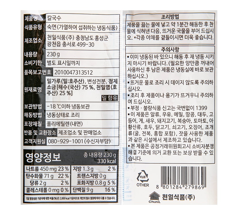 탱탱한 면발과 쫄깃쫄깃한 식감을 자랑하는 칼국수 면이에요. 물을 넣고 치대듯 반죽하는 다가수 숙성 제면 방식을 활용해, 면이 잘 퍼지지 않지요. 1인분씩 개별 포장되어 있으니, 깔끔하고 간편하게 요리해보세요. 어느 육수를 곁들여도 조화롭게 어우러진답니다.