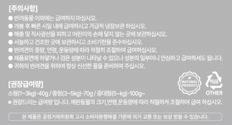 | 품명 및 모델명 | 펫얼라이언스 멍묵멍묵 1kg(오리우유껌) | 인증/허가 사항 | 사료관리법에 따른 성분등록번호 : 컨텐츠 참조 |