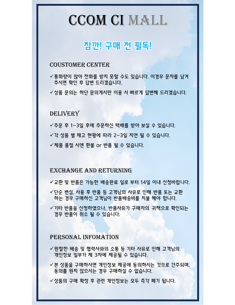 - ㆍ교환/반품에 관한 일반적인 사항은 판매자가 제시사항보다 관계법령이 우선합니다.