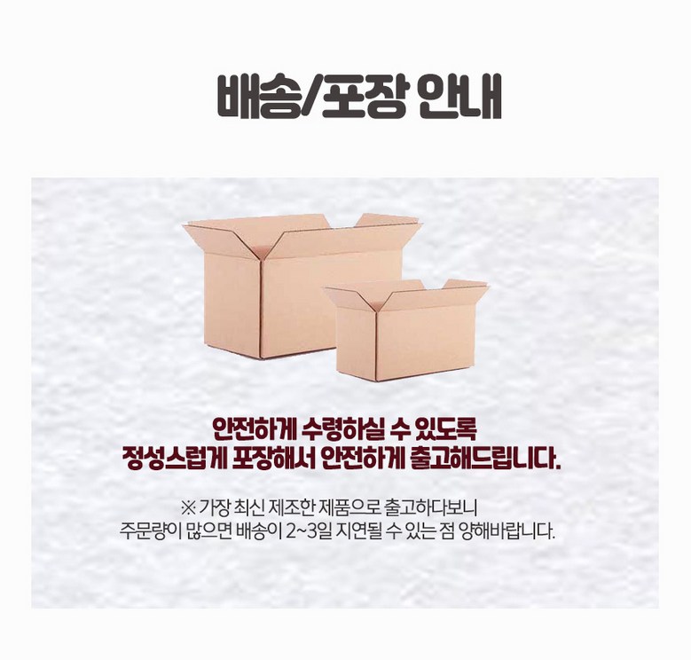 | 배송기간 | ㆍ도서산간 지역 등은 배송에 3-5일이 더 소요될 수 있습니다. - 천재지변, 물량 수급 변동 등 예외적인 사유 발생 시, 다소 지연될 수 있는 점 양해 부탁드립니다. | ||