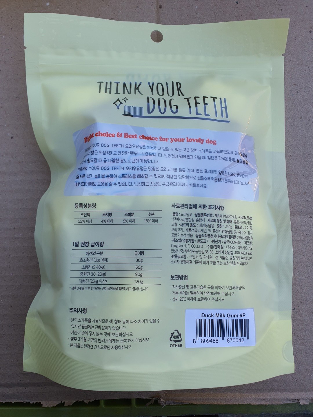 | 품명 및 모델명 | 강아지 Think your dog teeth 오리우유껌 중형 | 인증사항 | 사료관리법에 따른 성분등록번호 : 컨텐츠 참조 |