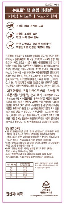 | 품명 및 모델명 | 뉴트로 캣 1세 이상 실내묘용 닭고기와 현미 | 인증/허가 사항 | 사료관리법에 따른 성분등록번호 : 컨텐츠 참조 |
