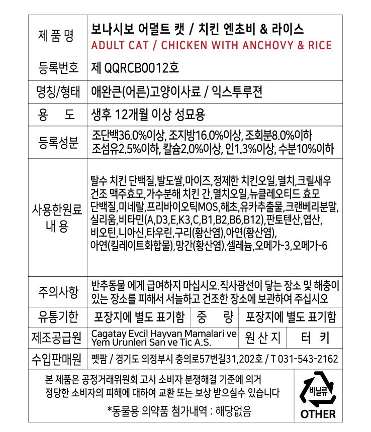 | 품명 및 모델명 | 보나시보 어덜트 캣 치킨 엔조비& 라이스 | 인증/허가 사항 | 사료관리법에 따른 성분등록번호 : 컨텐츠 참조 |