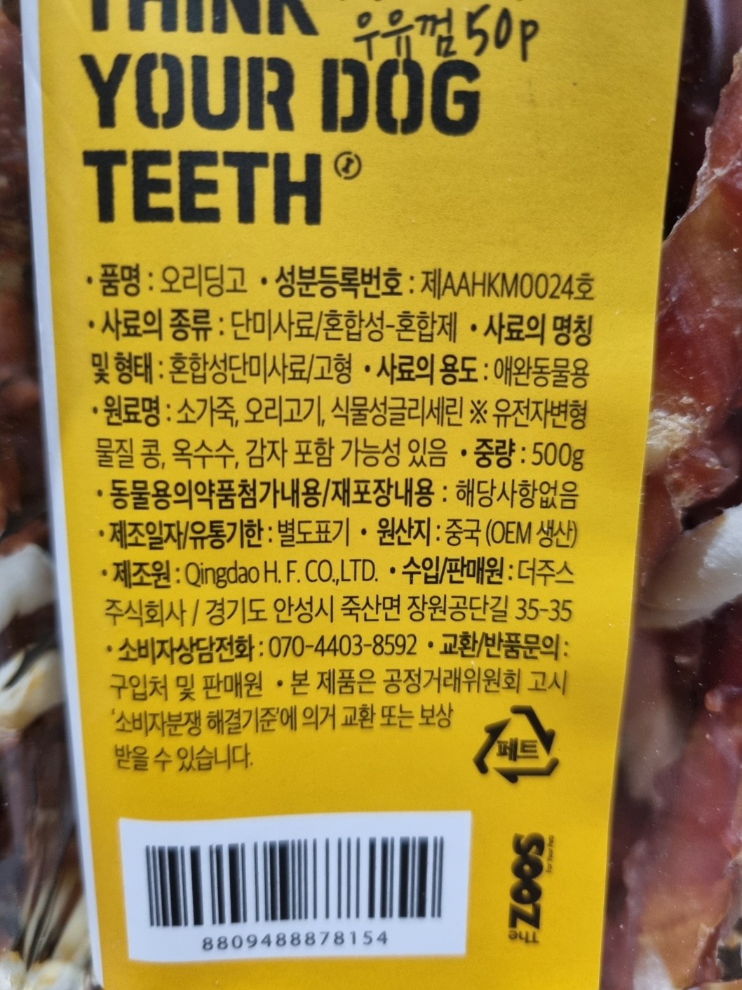 | 품명 및 모델명 | Think your dog teeth 오리딩고 우유껌 스틱 (500g) | 인증사항 | 사료관리법에 따른 성분등록번호 : 컨텐츠 참조 |