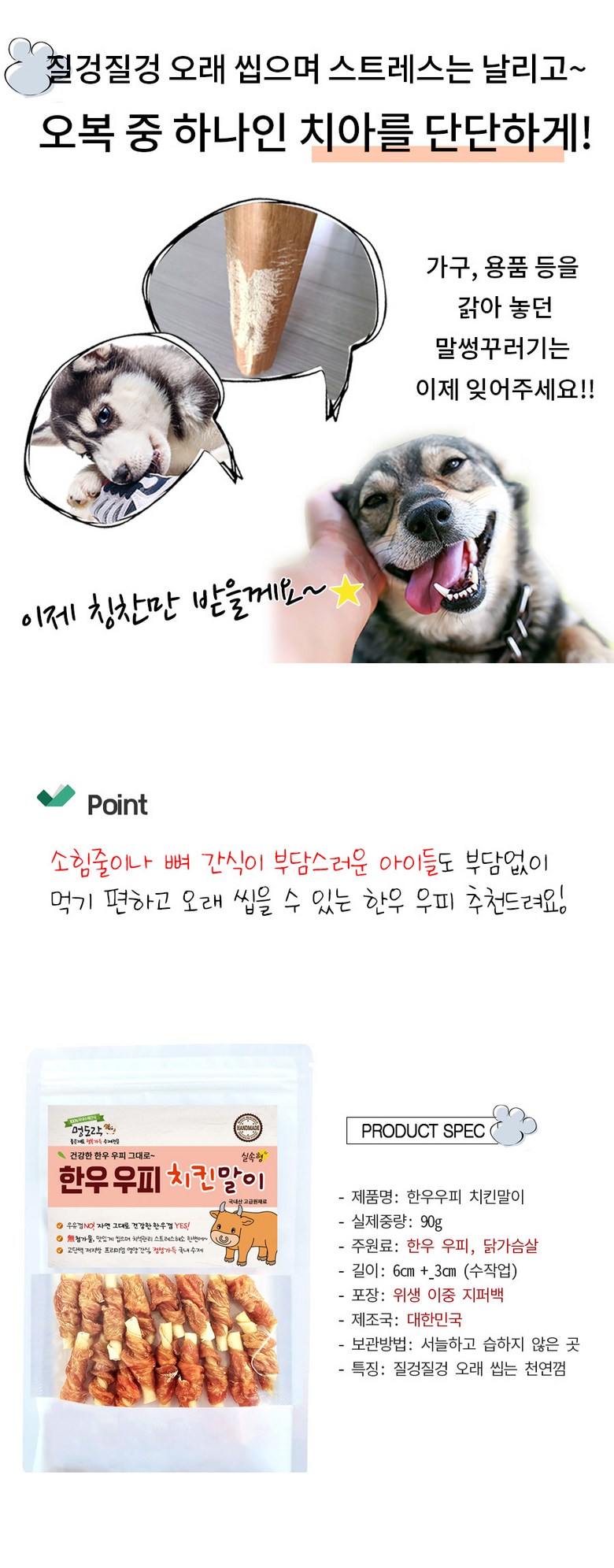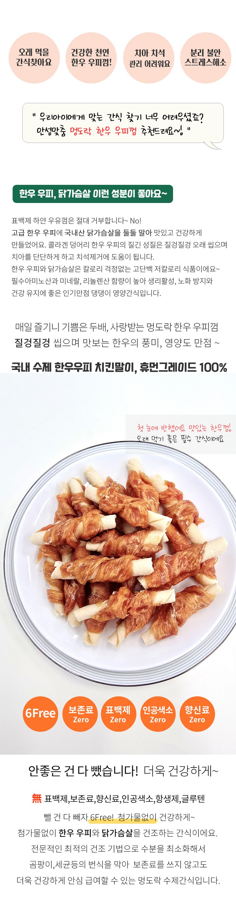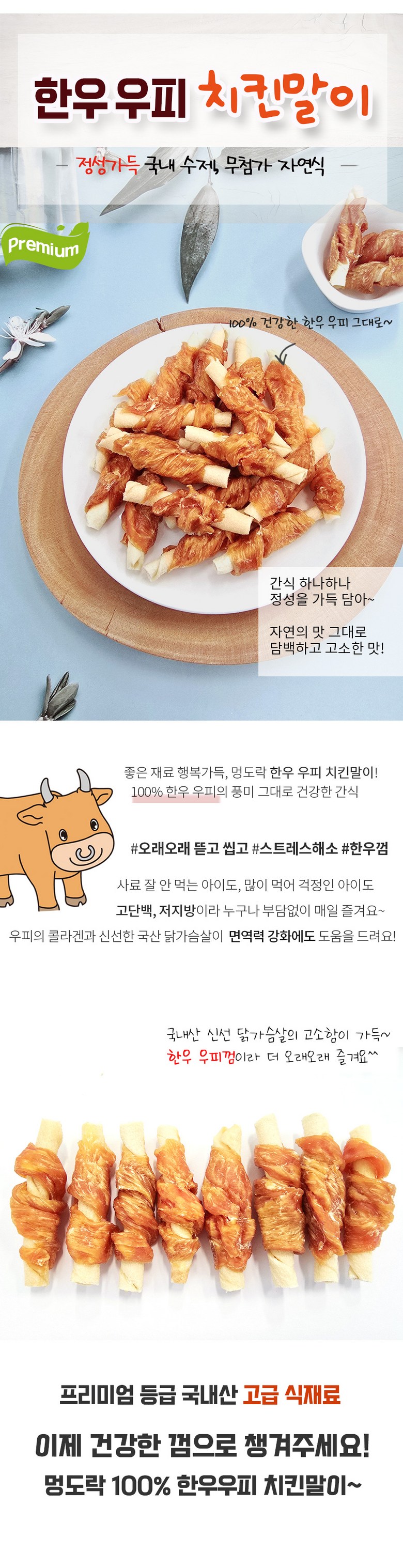 | 품명 및 모델명 | 멍도락 국내 수제간식 한우우피 치킨말이 90g | 인증/허가 사항 | 상품 상세페이지 참조 |