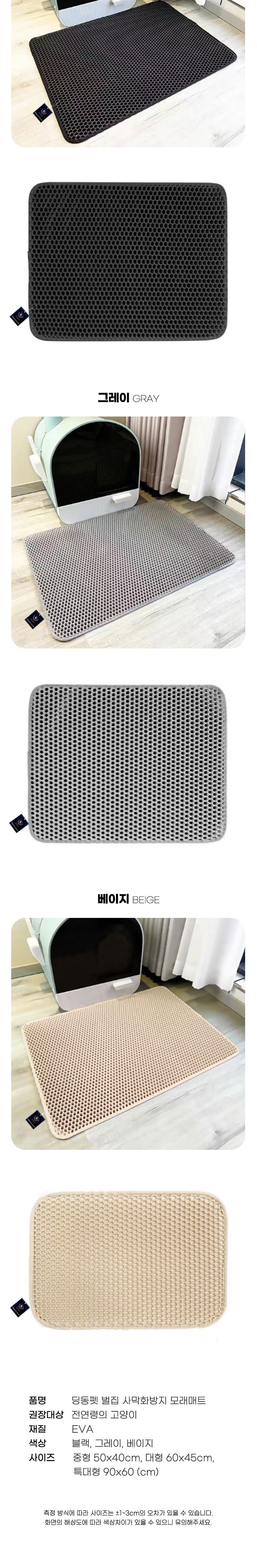 | 품명 및 모델명 | 딩동펫 고양이 벌집 사막화방지 화장실 모래매트 | 인증/허가 사항 | 해당없음 |