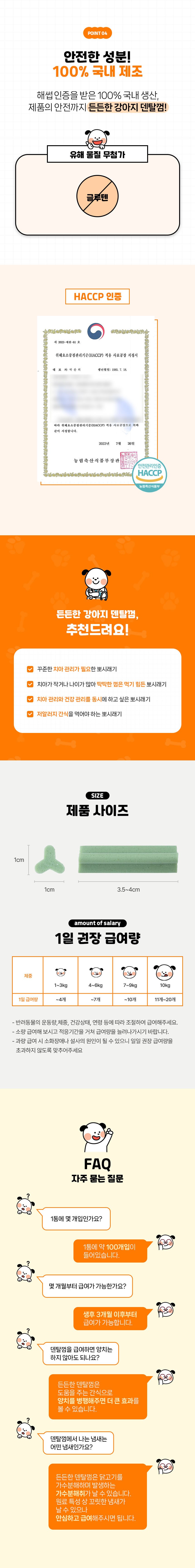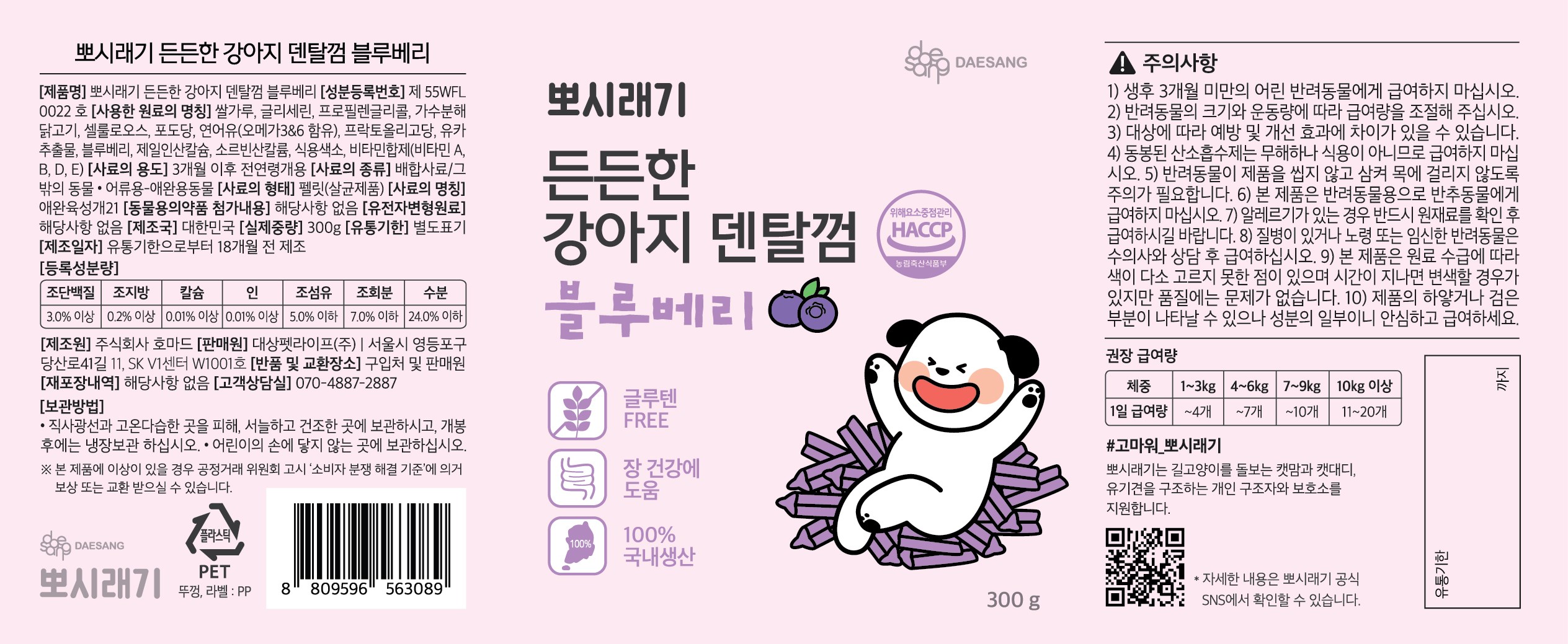 | 품명 및 모델명 | 뽀시래기 든든한 강아지 덴탈껌 블루베리 | 인증/허가 사항 | 사료관리법에 따른 성분등록번호 : 컨텐츠 참조 |