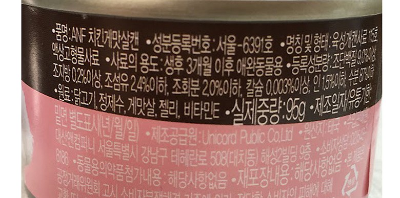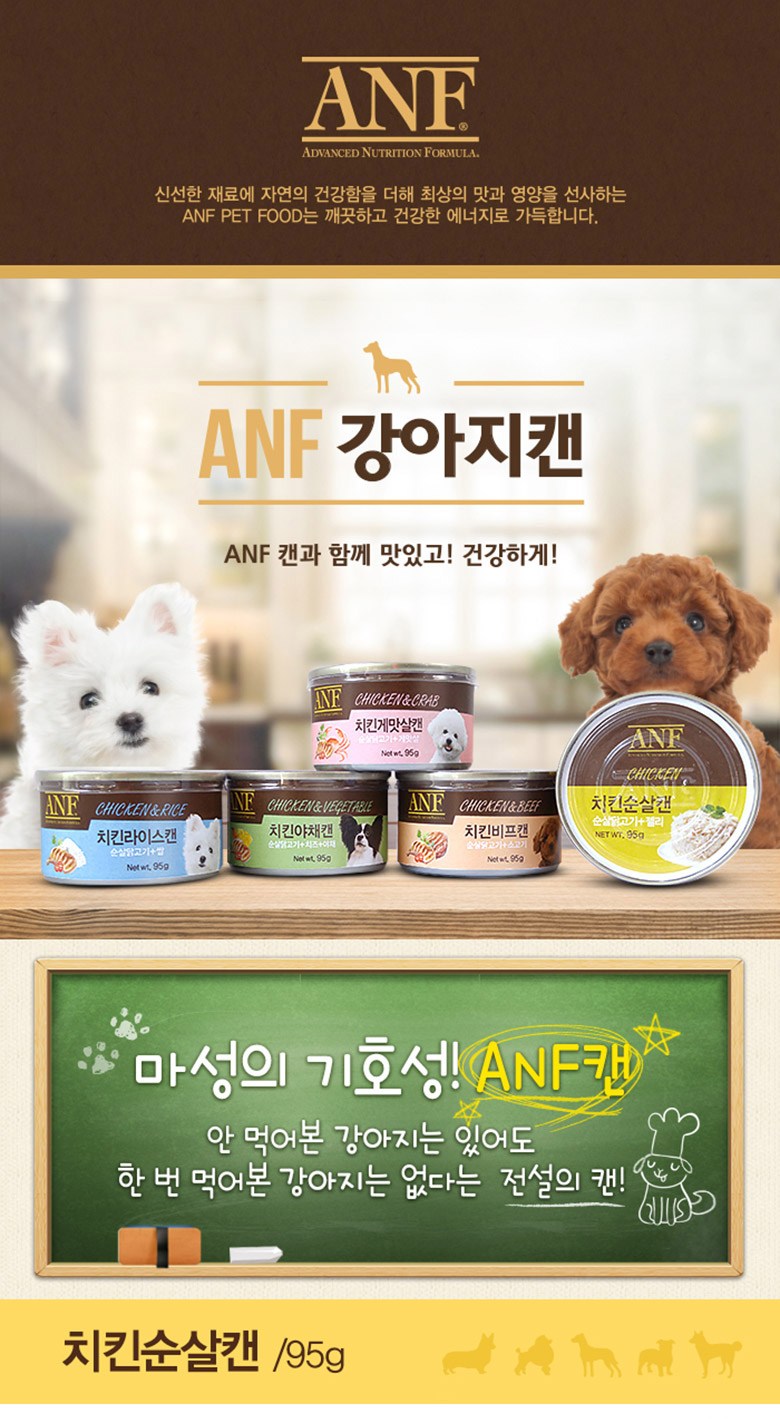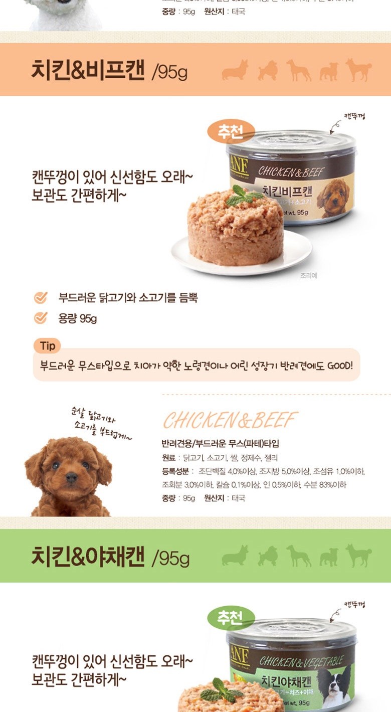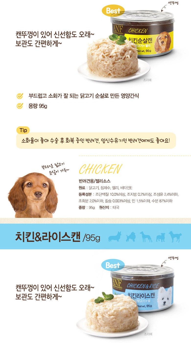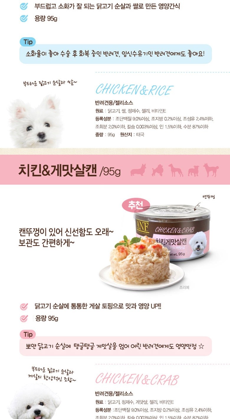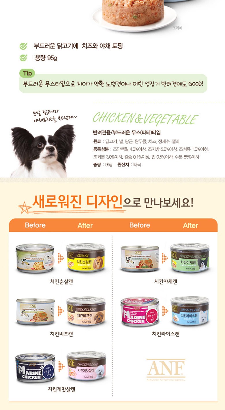 | 품명 및 모델명 | ANF 치킨 게맛살 캔 | 인증/허가 사항 | 사료관리법에 따른 성분등록번호 : 컨텐츠 참조 |