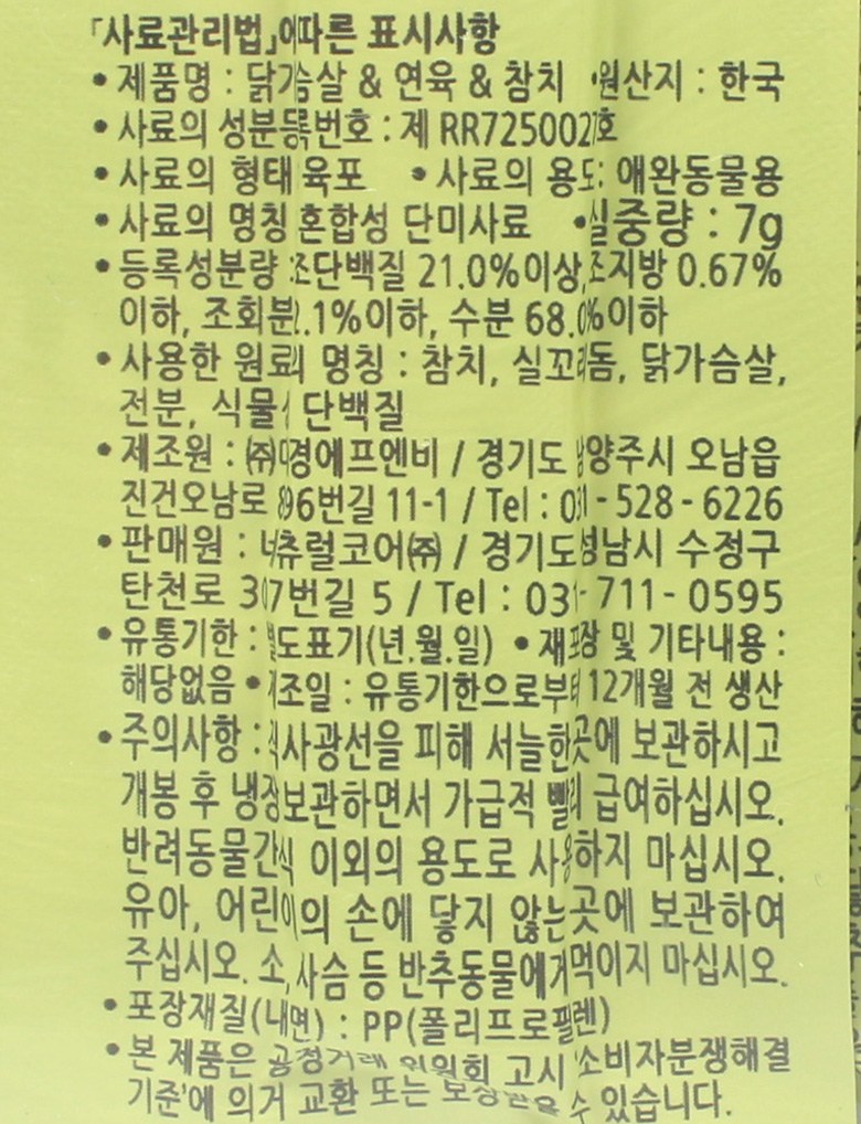 | 품명 및 모델명 | 닭가슴살&연육&참치 | 인증/허가 사항 | 사료관리법에 따른 성분등록번호 : 컨텐츠 참조 |
