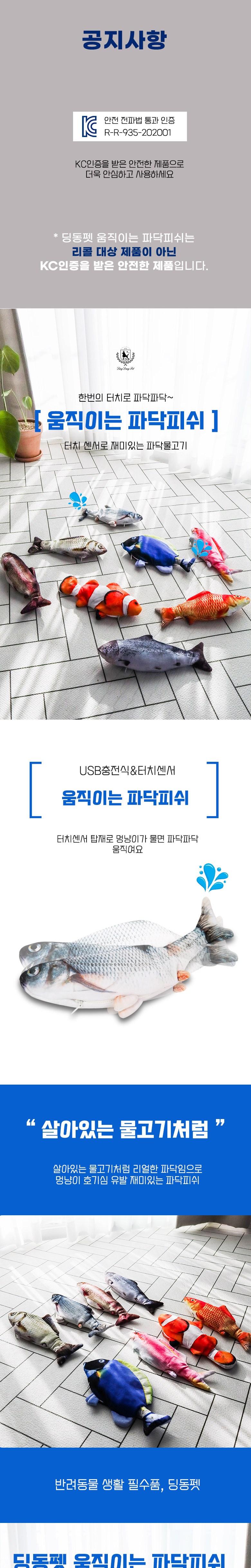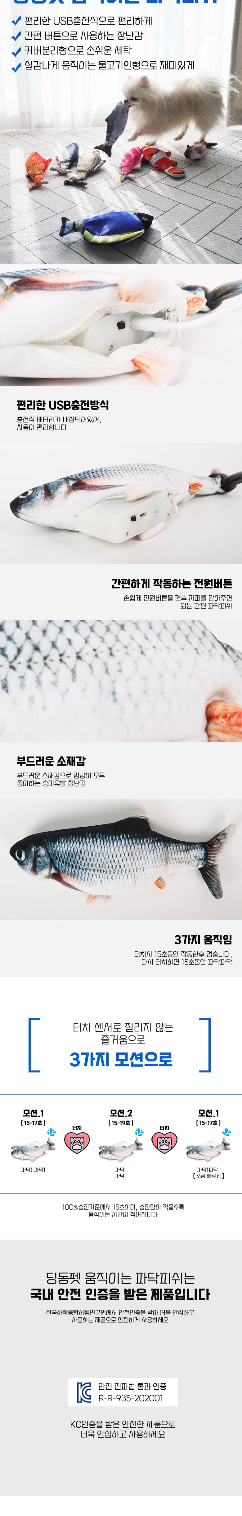 | 품명 및 모델명 | 딩동펫 움직이는 파닥피쉬 | 인증/허가 사항 | 본품: R-R-935-202001, 전지: YU101243-20001 |