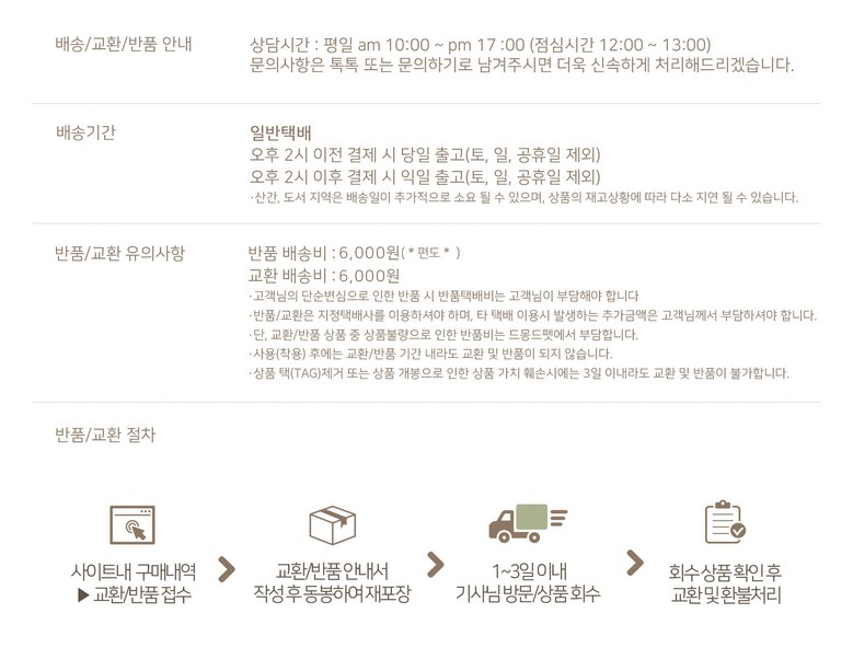 - ㆍ모니터 해상도의 차이로 인해 색상이나 이미지가 실제와 달라, 고객이 단순 변심으로 교환/반품을 무료로 요청하는 경우