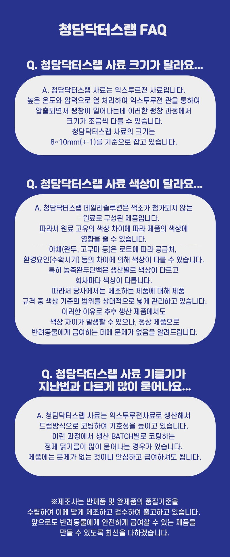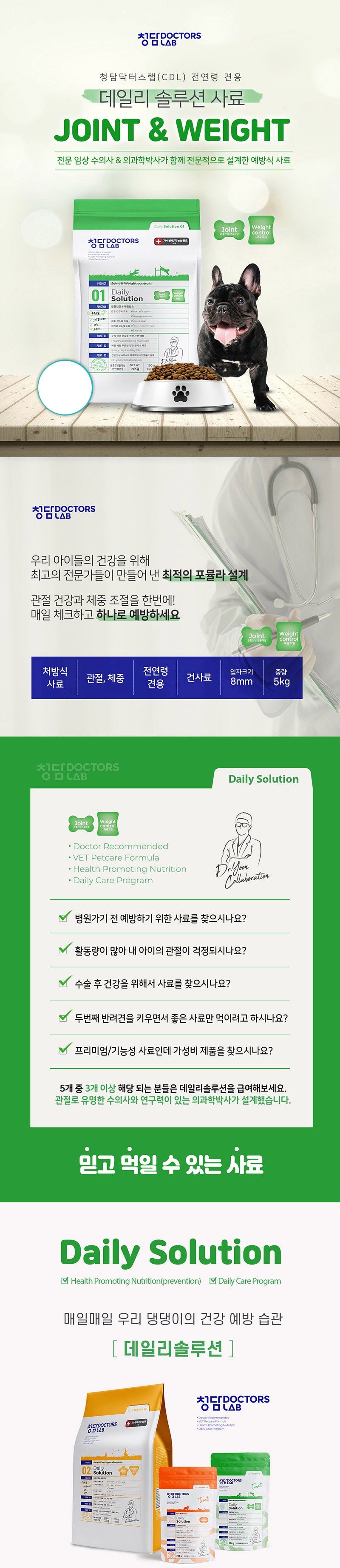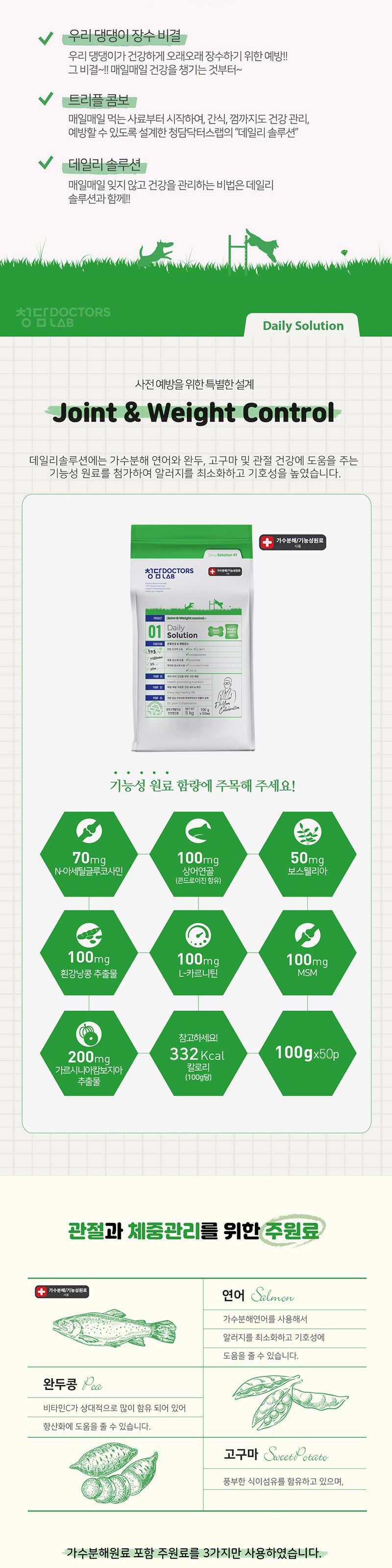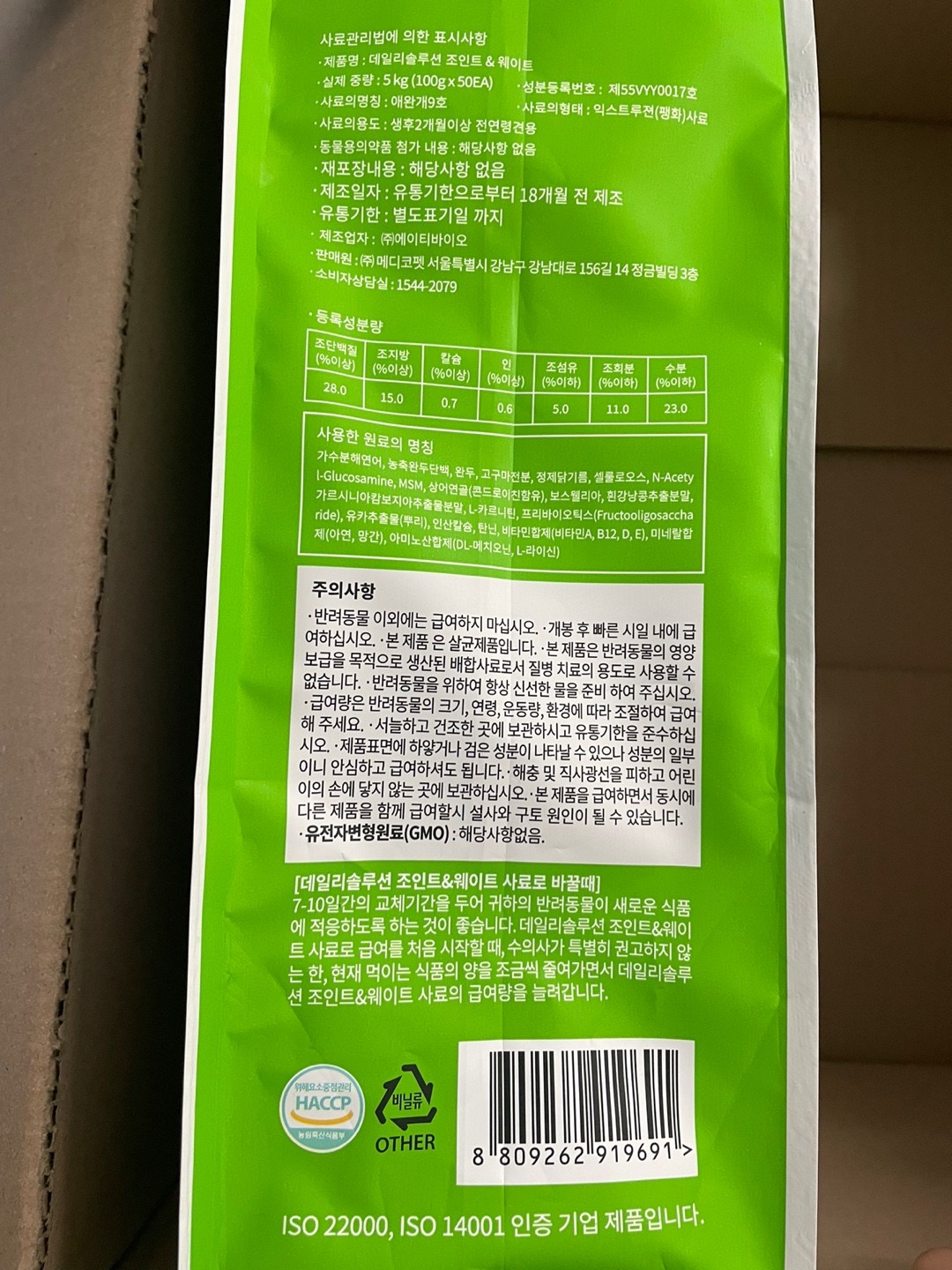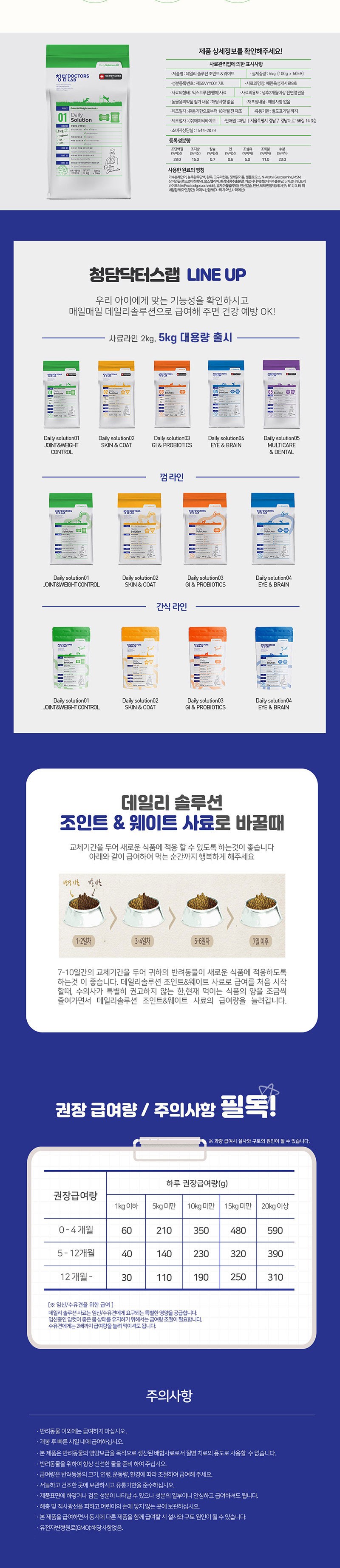 | 품명 및 모델명 | 데일리솔루션 조인트&웨이트 | 인증/허가 사항 | 사료관리법에 따른 성분등록번호 : 컨텐츠 참조 |