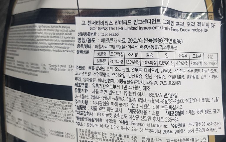 | 품명 및 모델명 | 고 센서티비티스 리미티드 인그레디언트 그레인 프리 오리 레시피 DF | 인증/허가 사항 | 사료관리법에 따른 성분등록번호 : 컨텐츠 참조 |