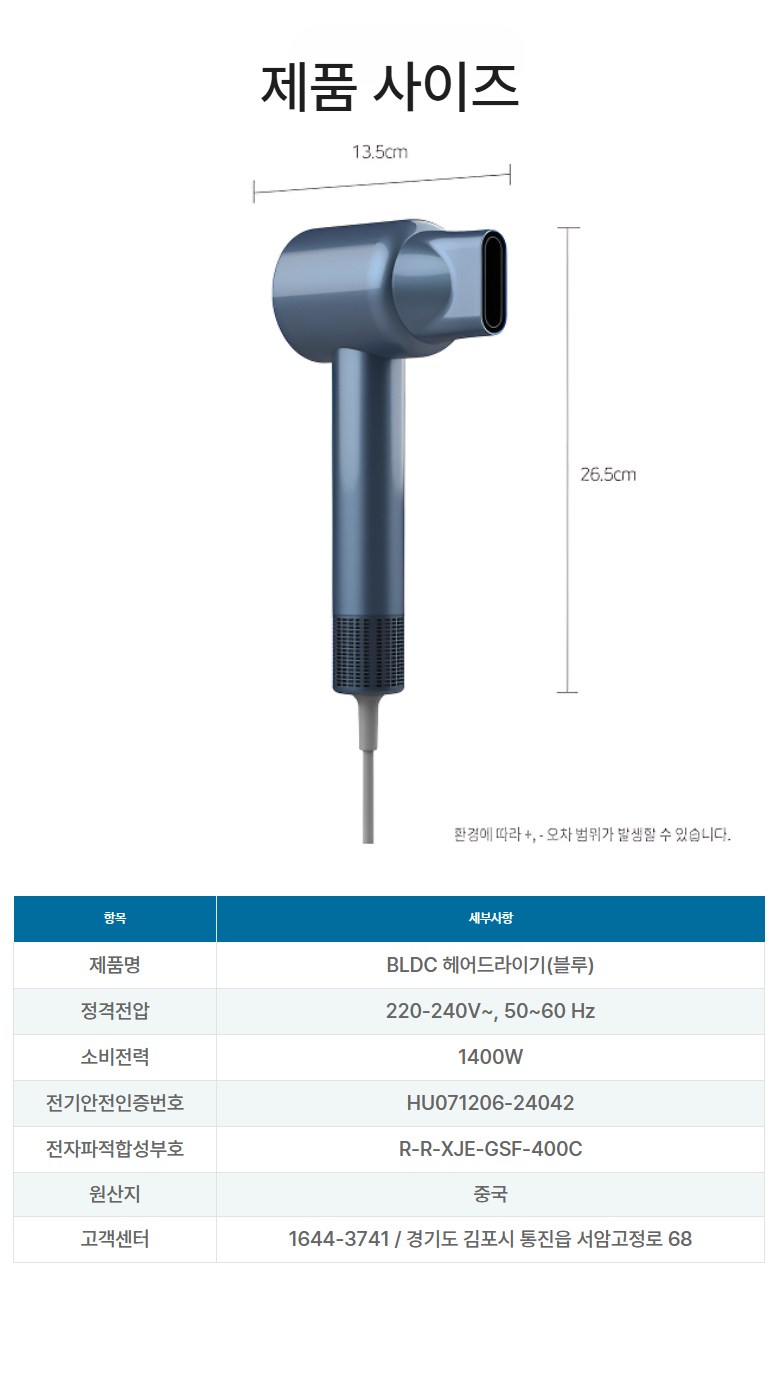 | 품명 및 모델명 | BLDC 헤어드라이기 | KC 인증정보 | 상품 상세페이지 참조 |