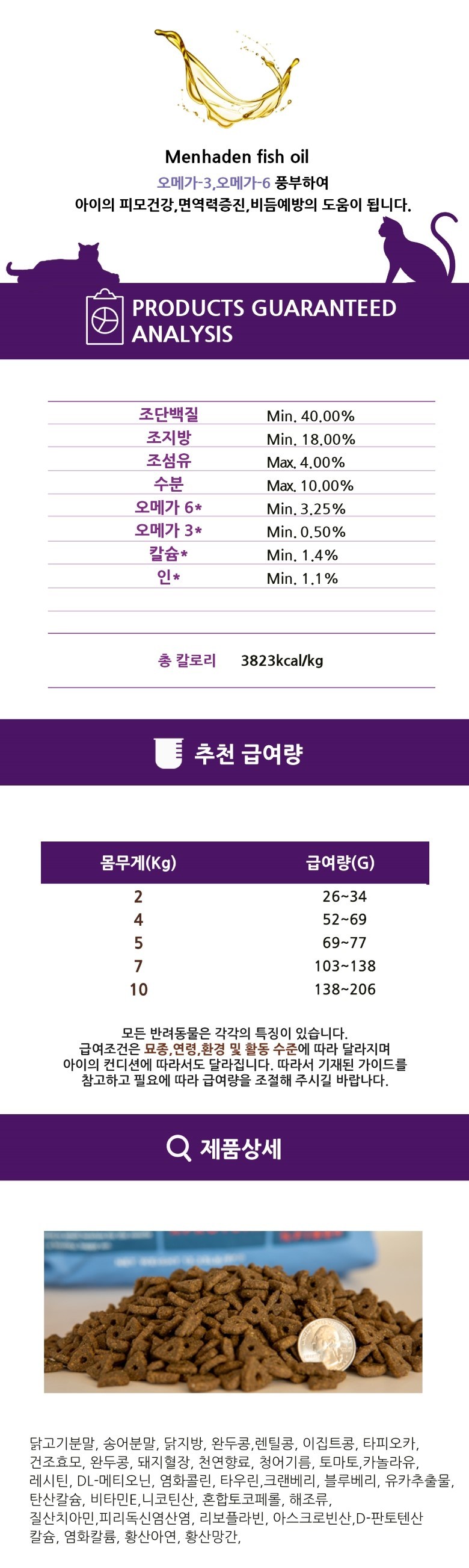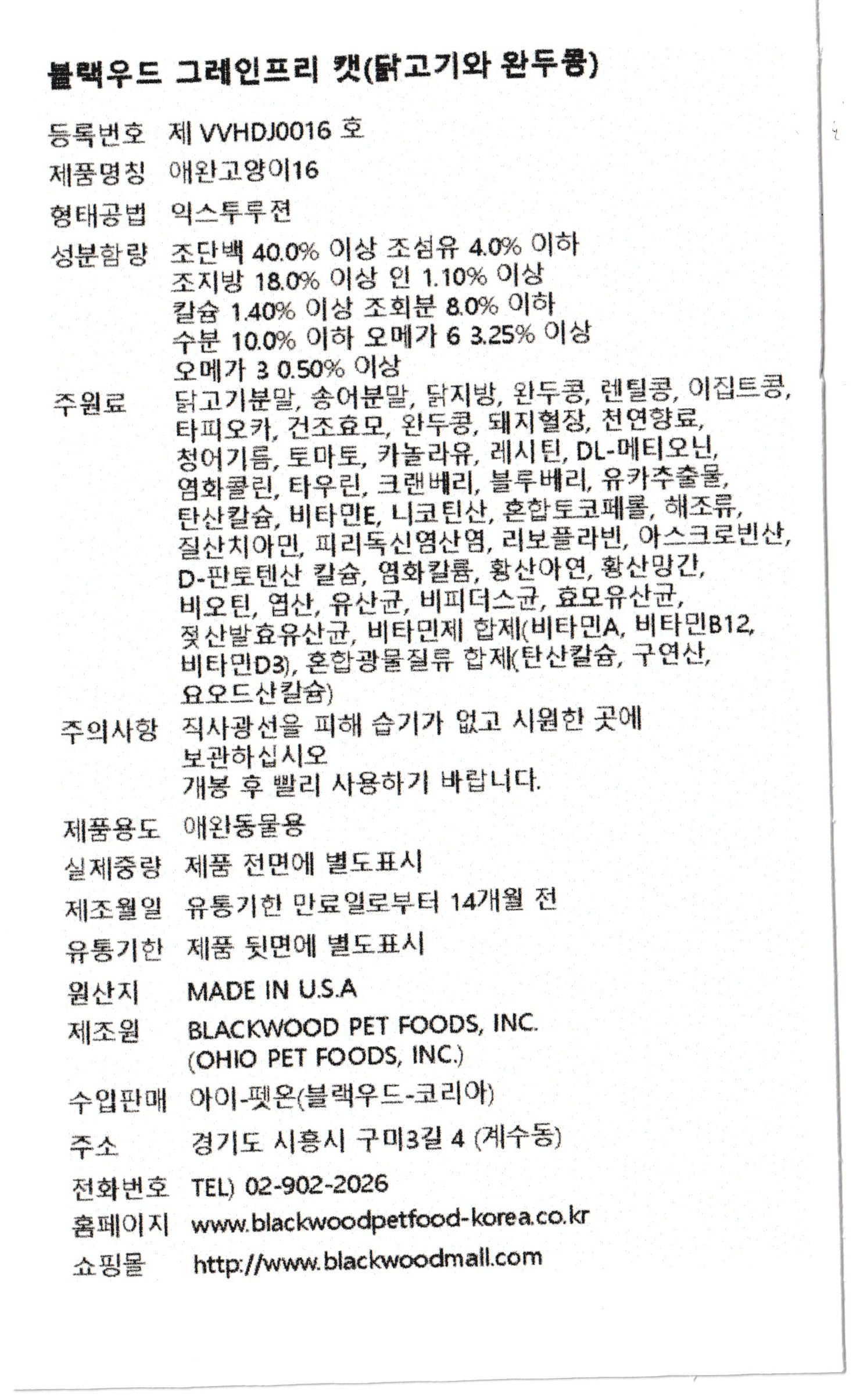 | 품명 및 모델명 | 블랙우드 그레인프리 캣(닭고기와 완두콩) | 인증/허가 사항 | 사료관리법에 따른 성분등록번호 : 컨텐츠 참조 |
