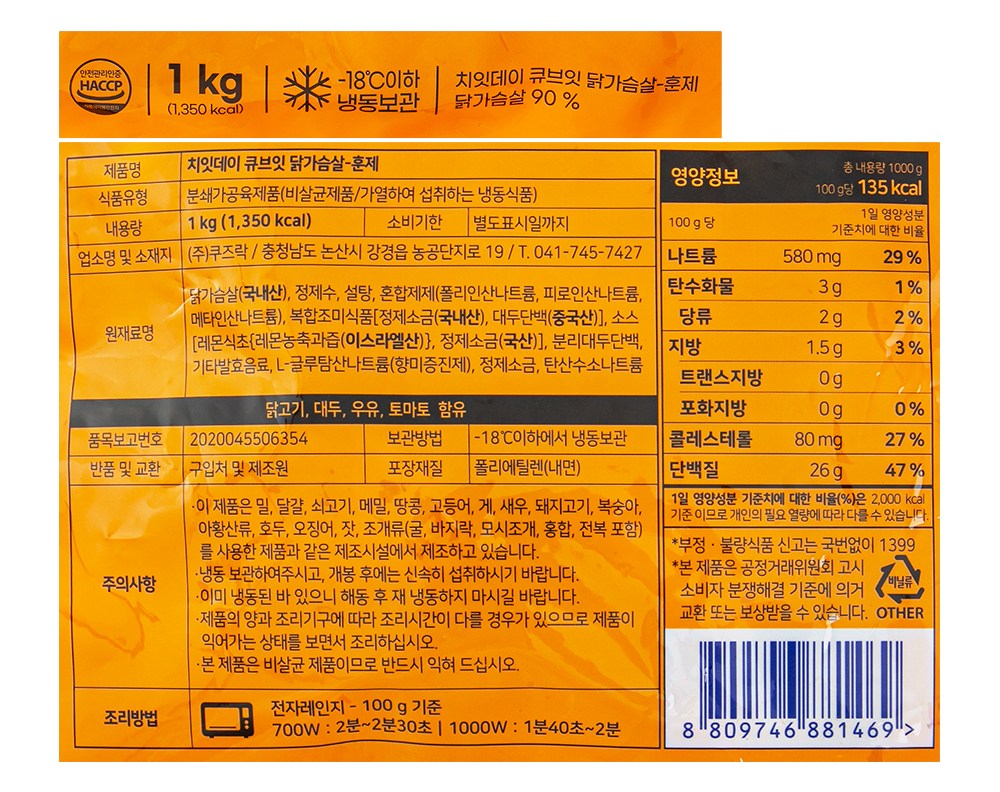 쏙쏙 먹기 좋은 크기의 훈제 닭가슴살을 소개해요. 퍽퍽함 없이 쫄깃한 식감이라 부담 없이 즐길 수 있죠. 냉동실에 보관해두고 필요할 때마다 소량씩 꺼내 쓰면 되니 활용도도 높답니다. 전자레인지에 조리해 그대로 드시거나, 프라이팬에서 구워 샐러드 토핑으로 활용해보세요.