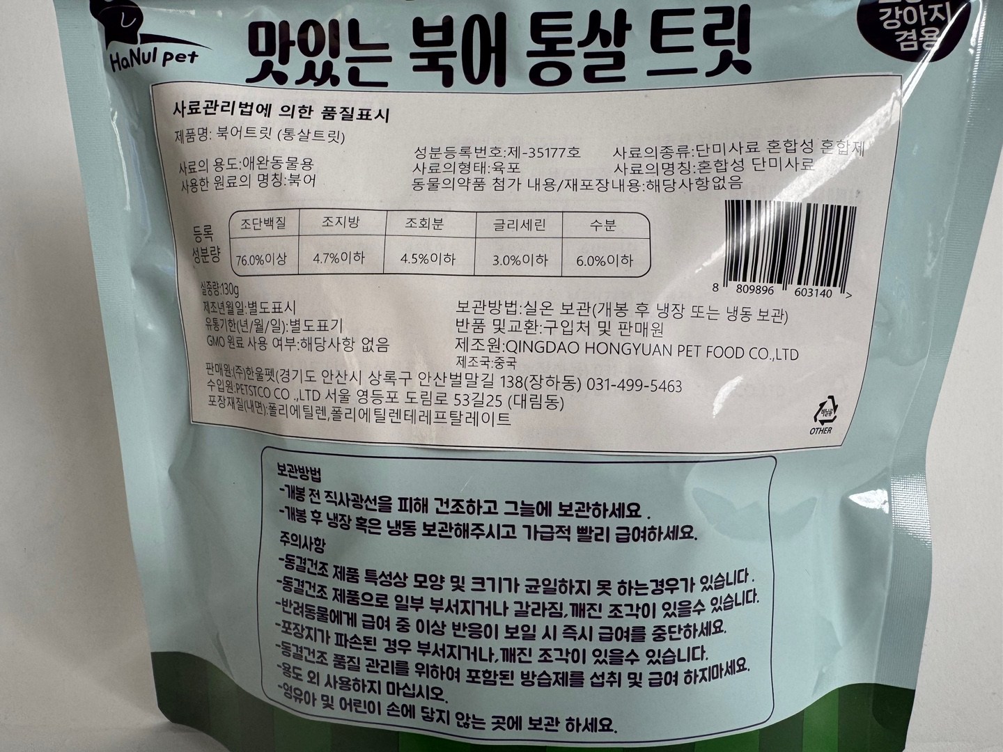 | 품명 및 모델명 | 북어트릿(통살트릿) | 인증/허가 사항 | 사료관리법에 따른 성분등록번호 : 컨텐츠 참조 |