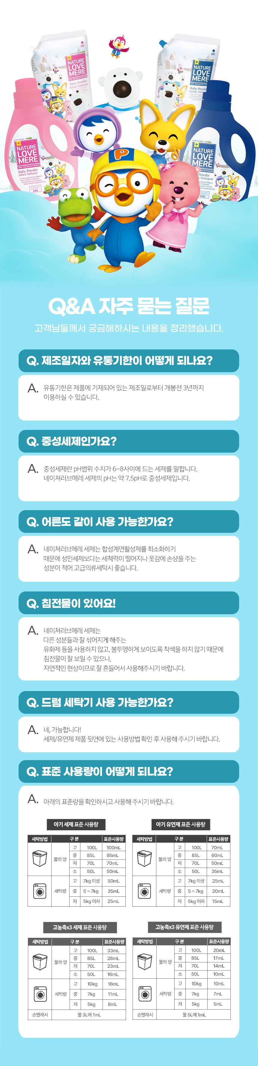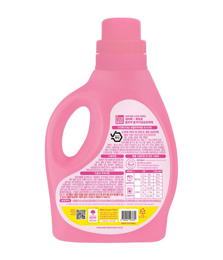 | 품목 및 제품명 | 섬유유연제 / 네러메 x 뽀로로 울트라 젤 아기섬유유연제 | 용도(표백제의 경우 계열을 함께표시) 및 제형 | 섬유용, 신발용 / 액체형 |